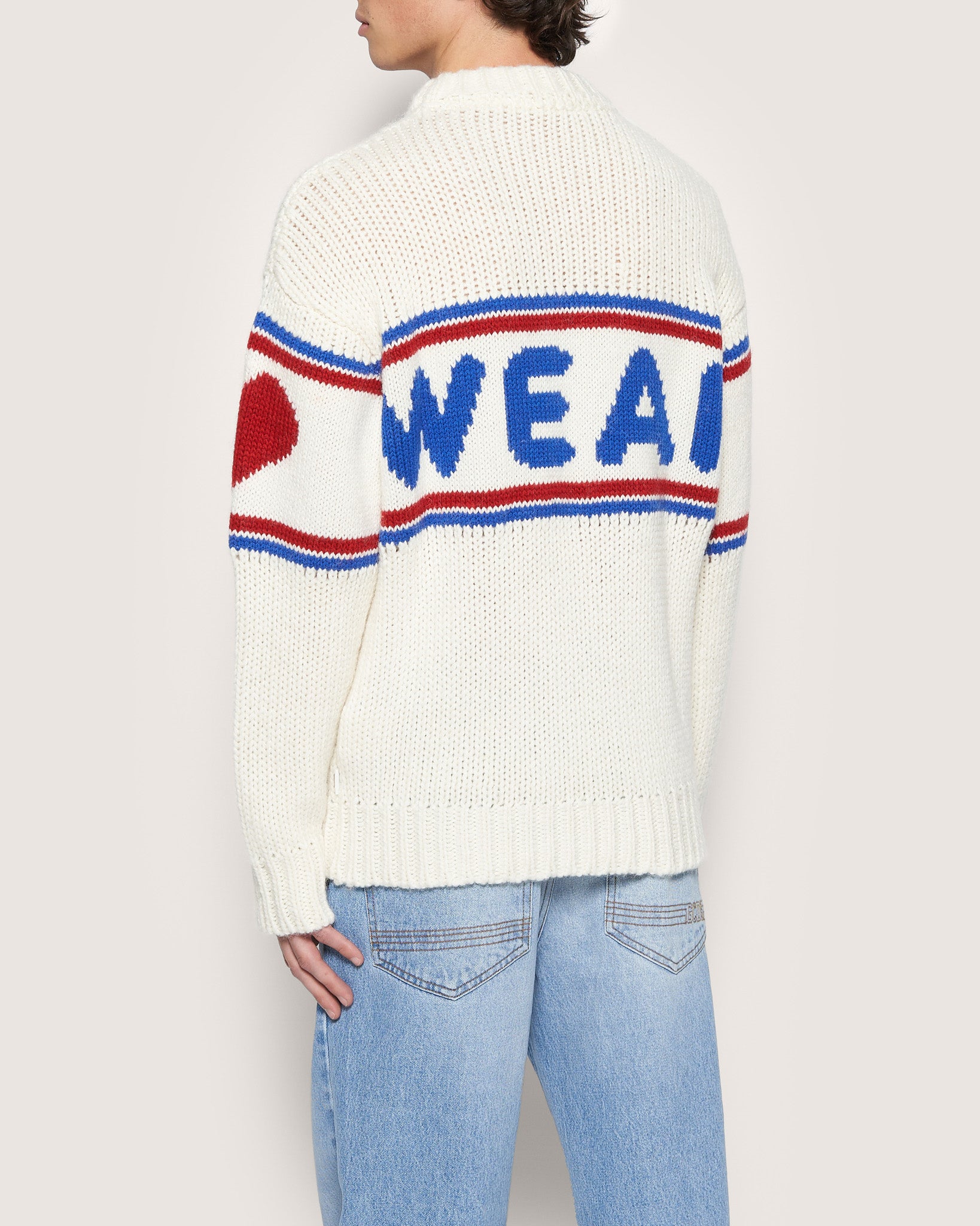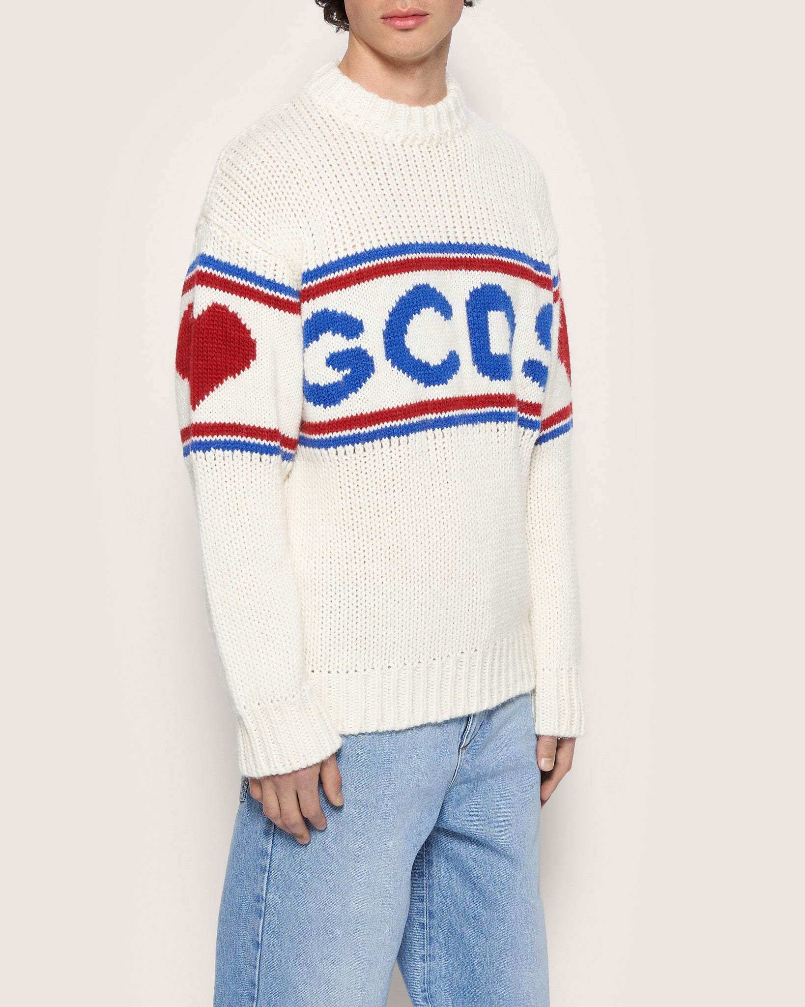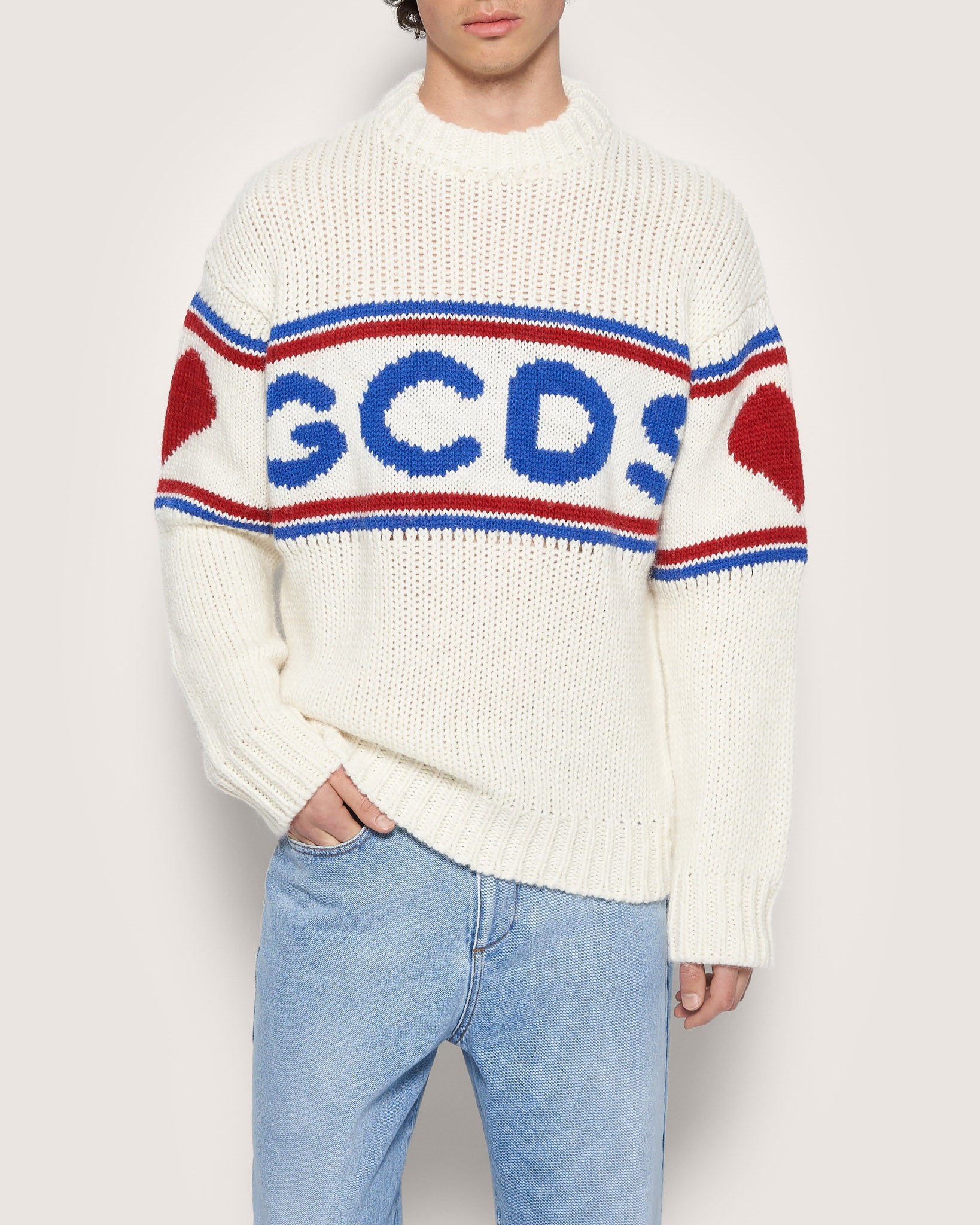 Chunky, jersey GCDS crew neck sweater with bold collar. Inlaid Cute GCDS logo band with hearts on front, back and sleeves. Over-sized.