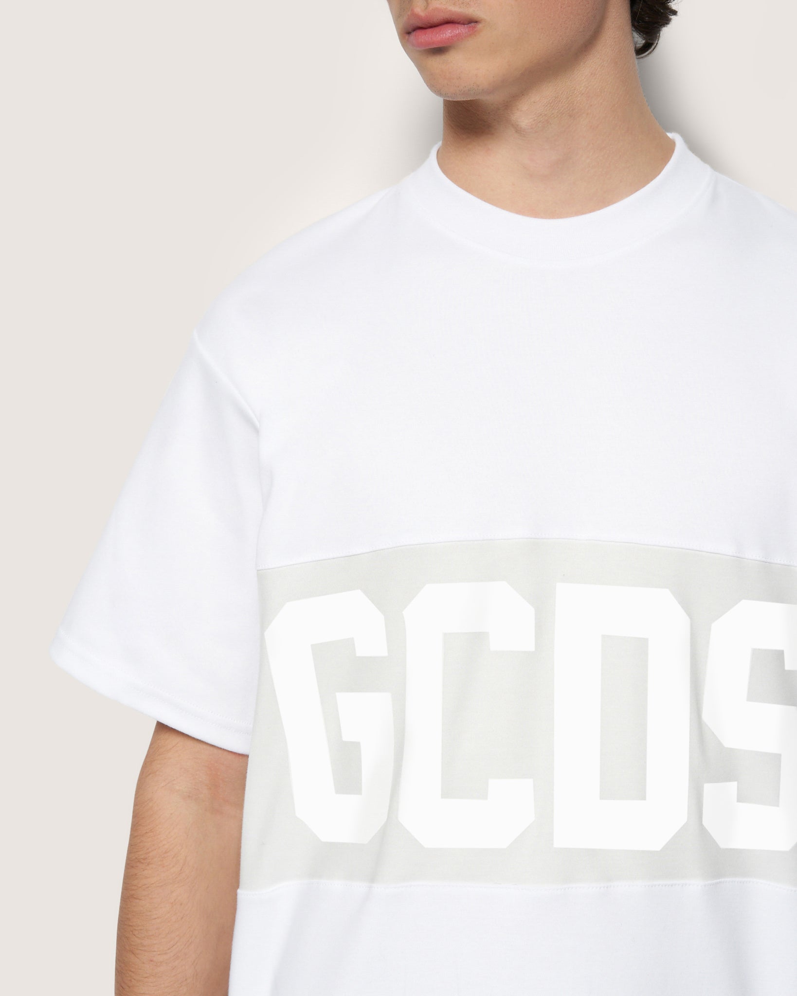 Cotton GCDS T-shirt with tone-on-tone inlaid logo band, silkscreen print, front and back. Classic cut, regular fit.