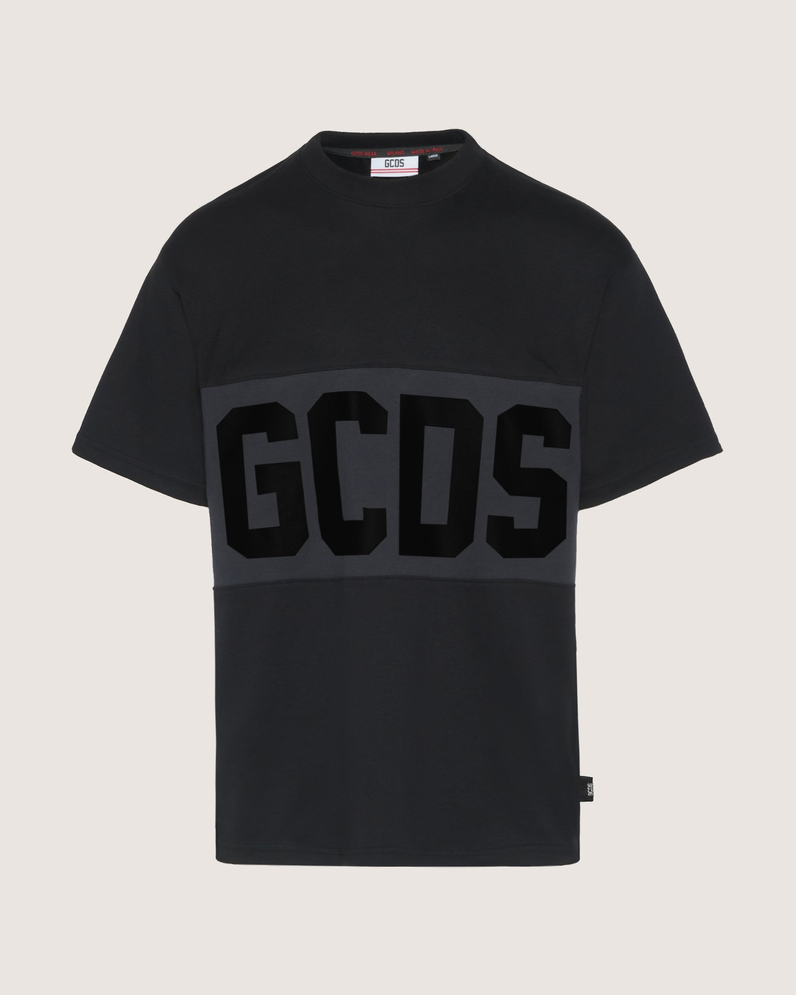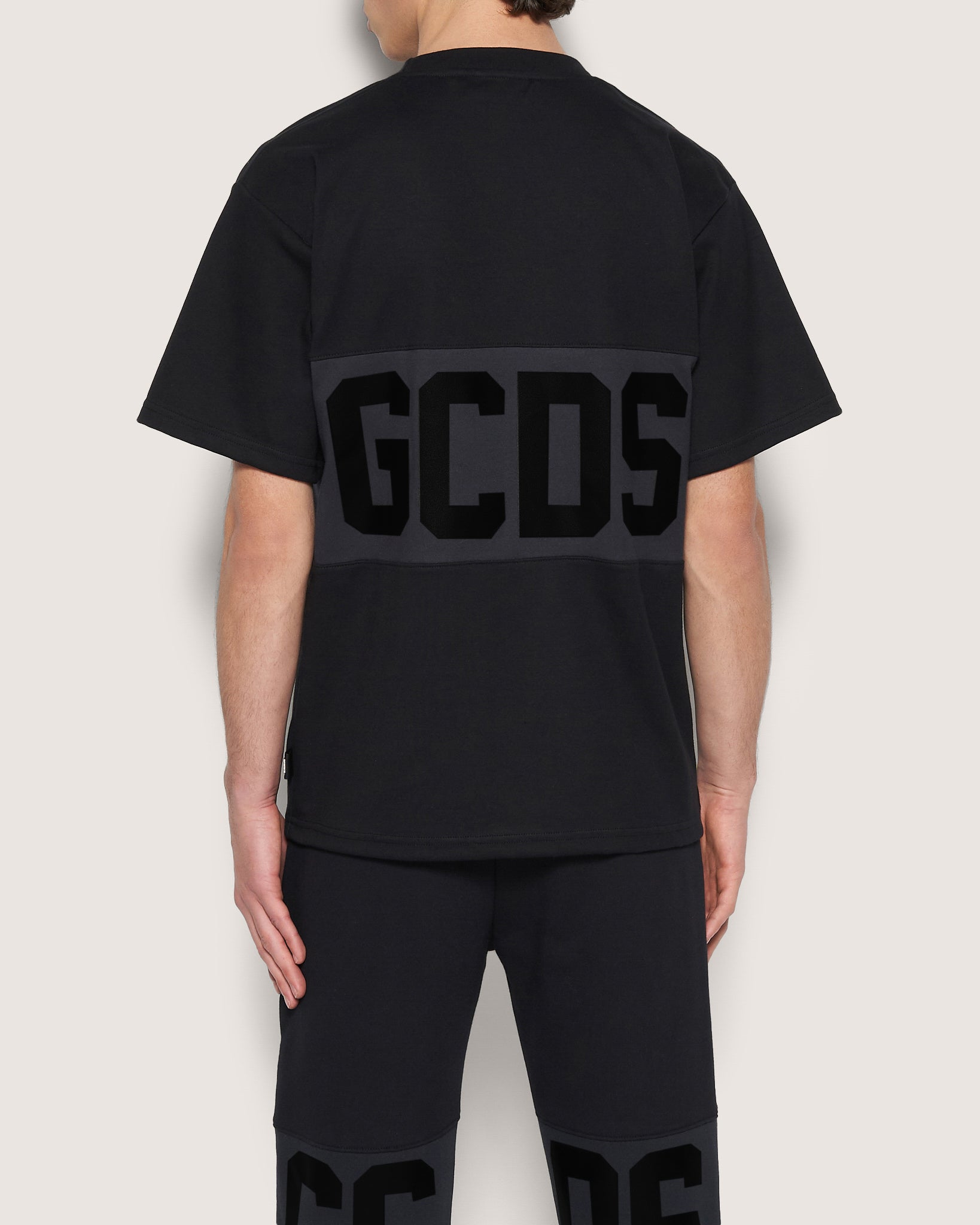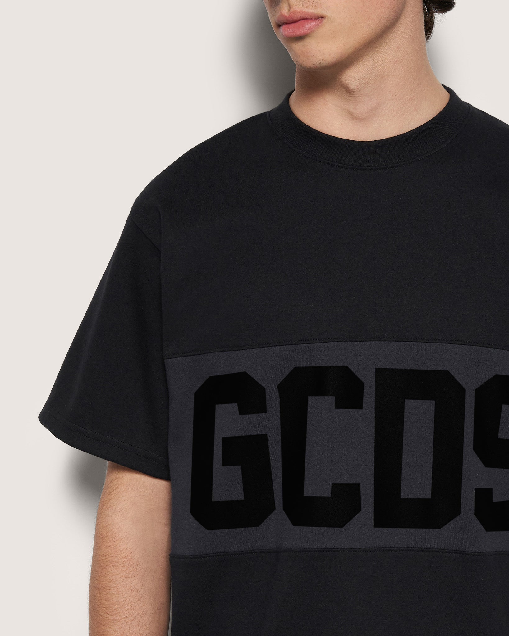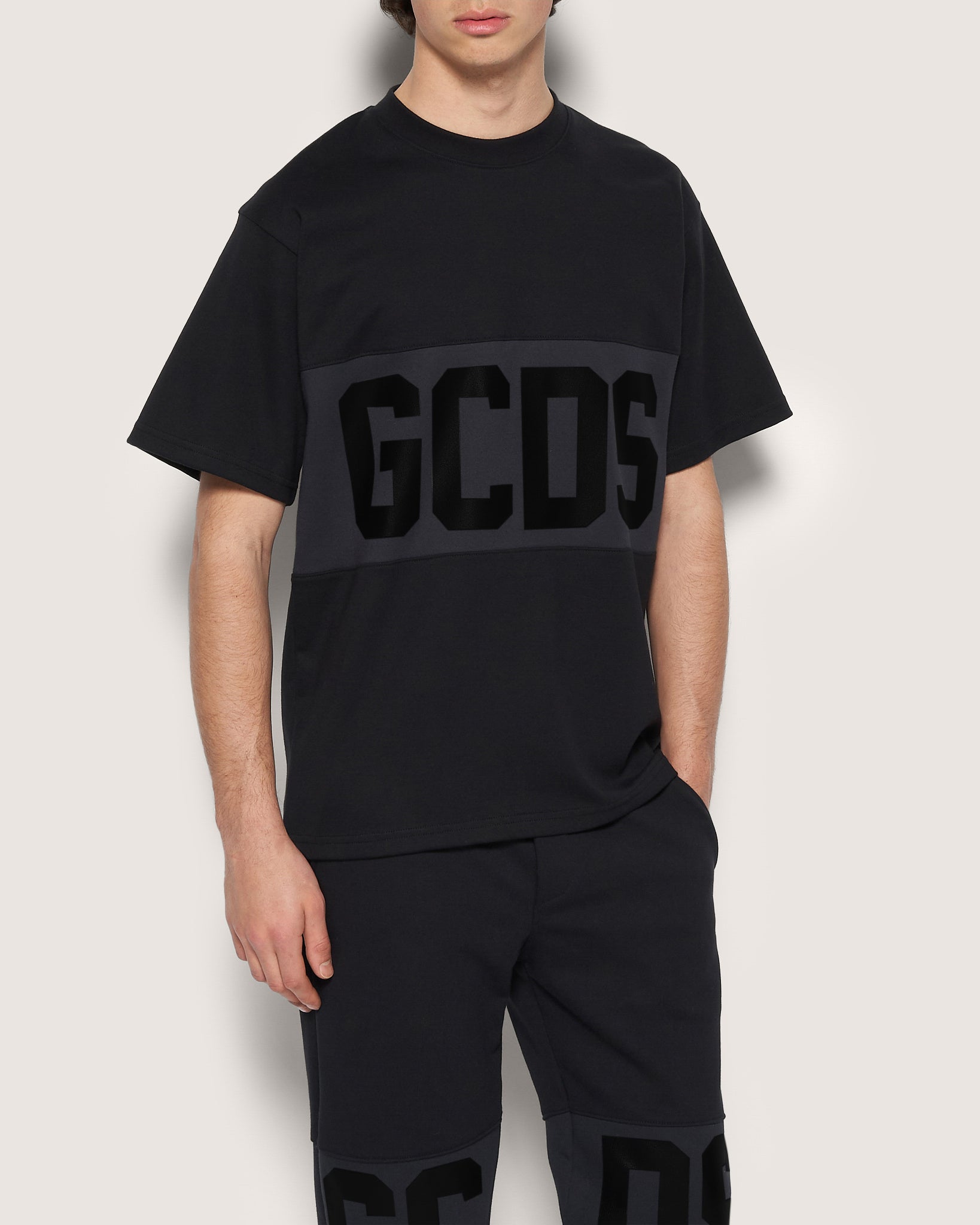 Cotton GCDS T-shirt with tone-on-tone inlaid logo band, silkscreen print, front and back. Classic cut, regular fit.