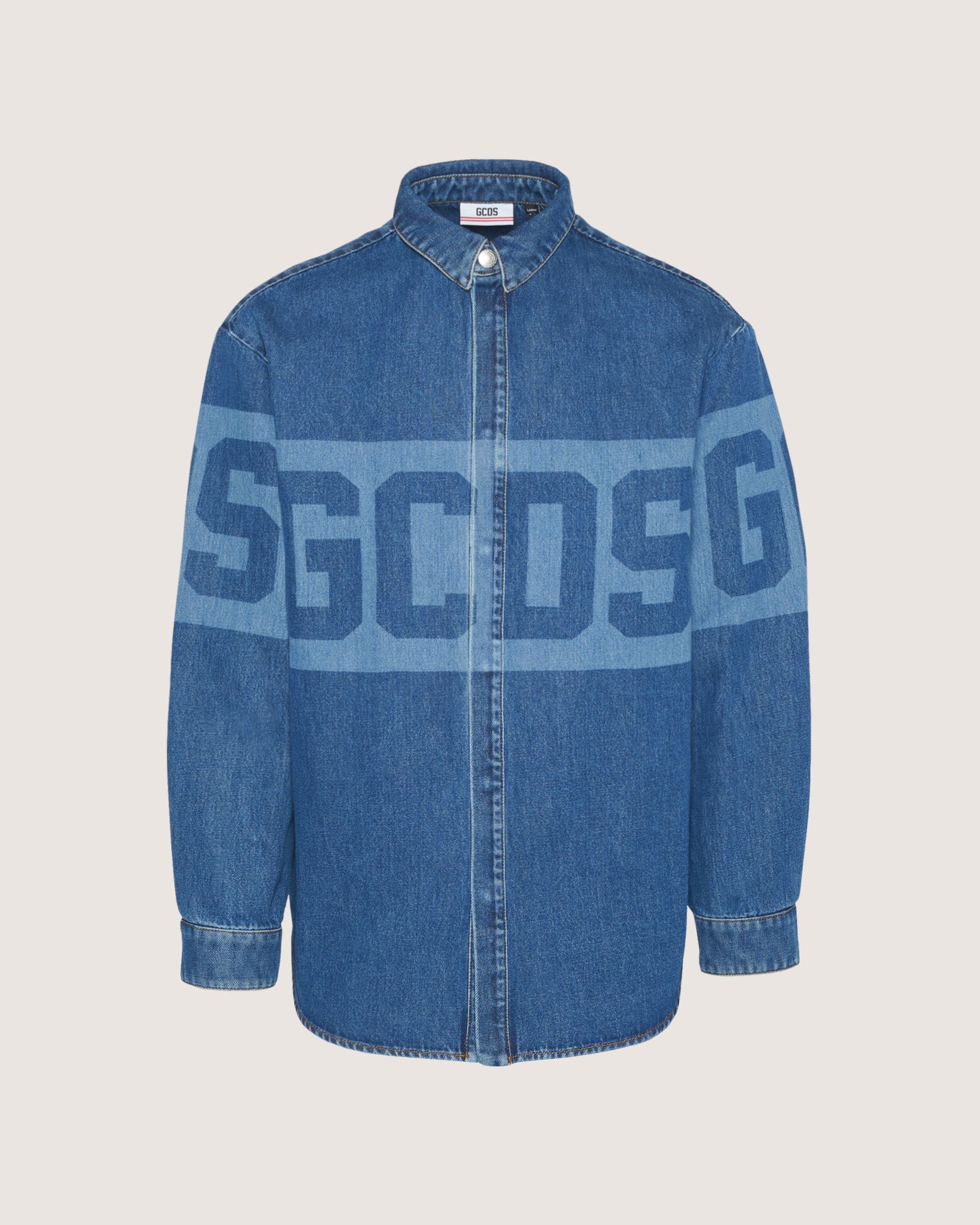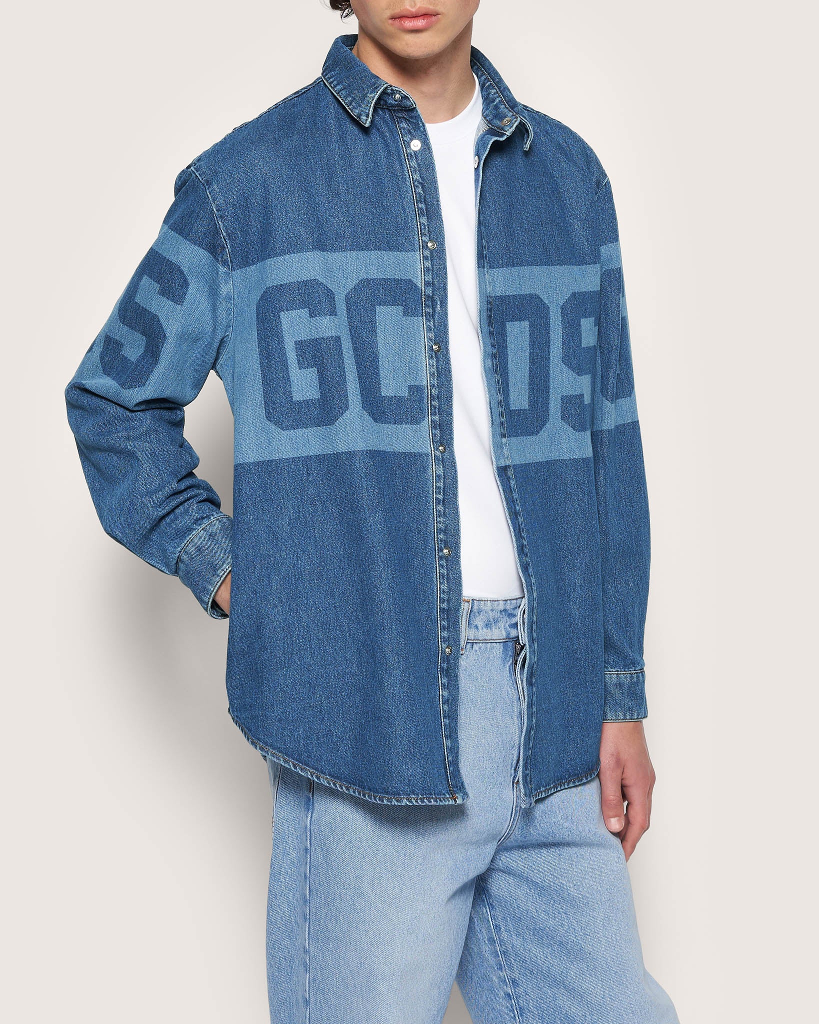 Bleached, stone-washed denim GCDS shirt. Contrasting laser logo band, on front and sleeves. Regular fit.