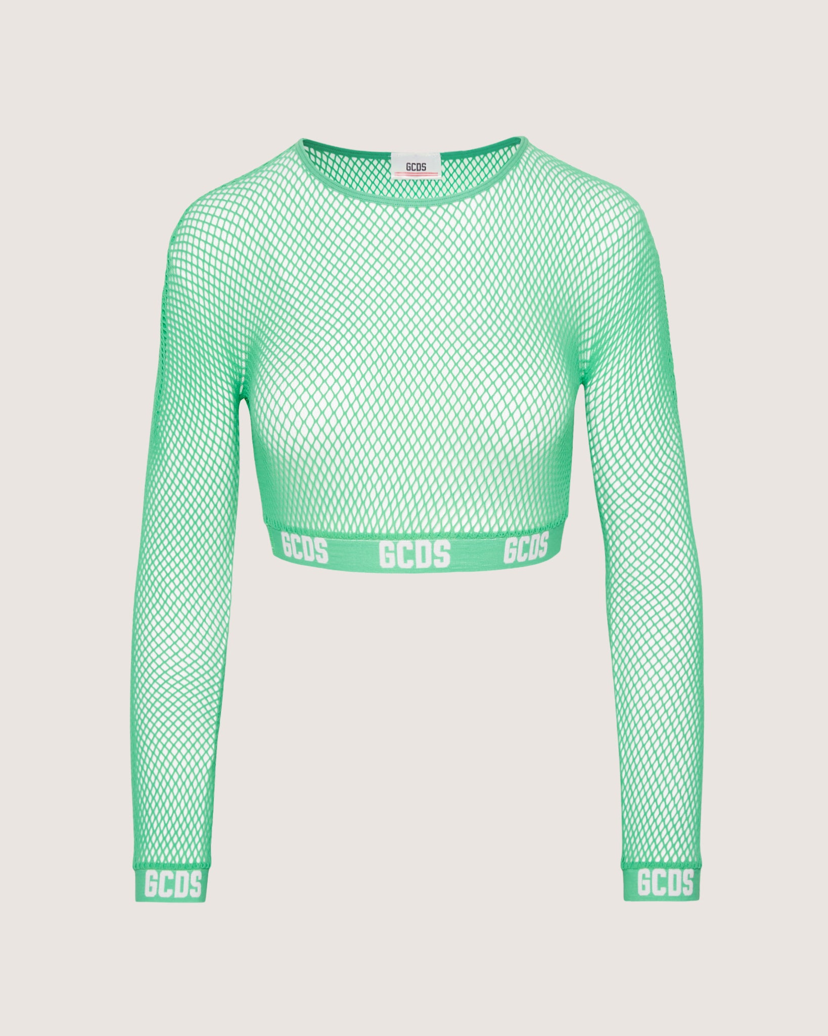 Fishnet Cropped Top with long sleeves and elastic logo band.