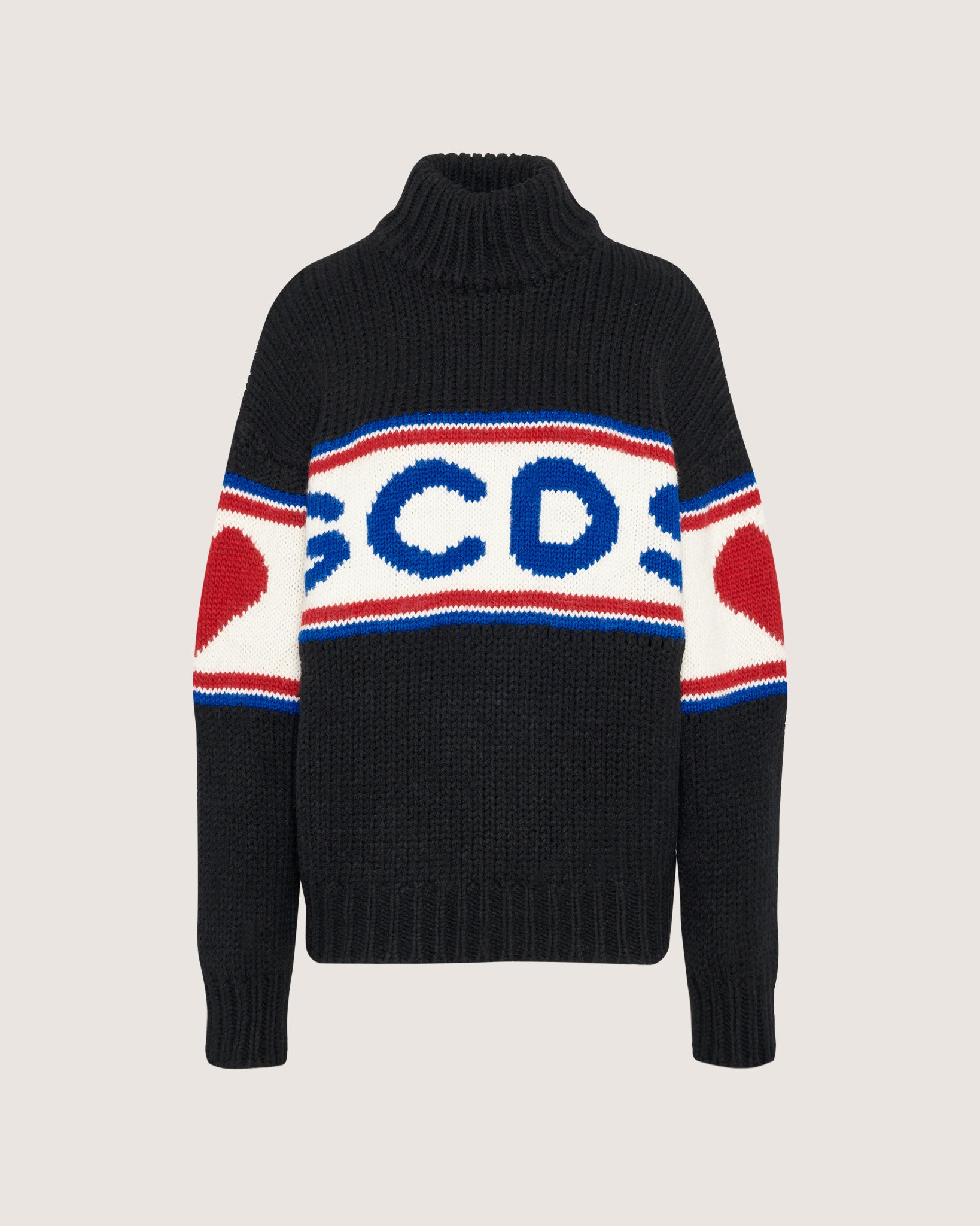 Soft jersey GCDS sweater, high-necked. Wool-blend GCDS logo band on the front and back, with hearts on the sleeves. Over-sized.