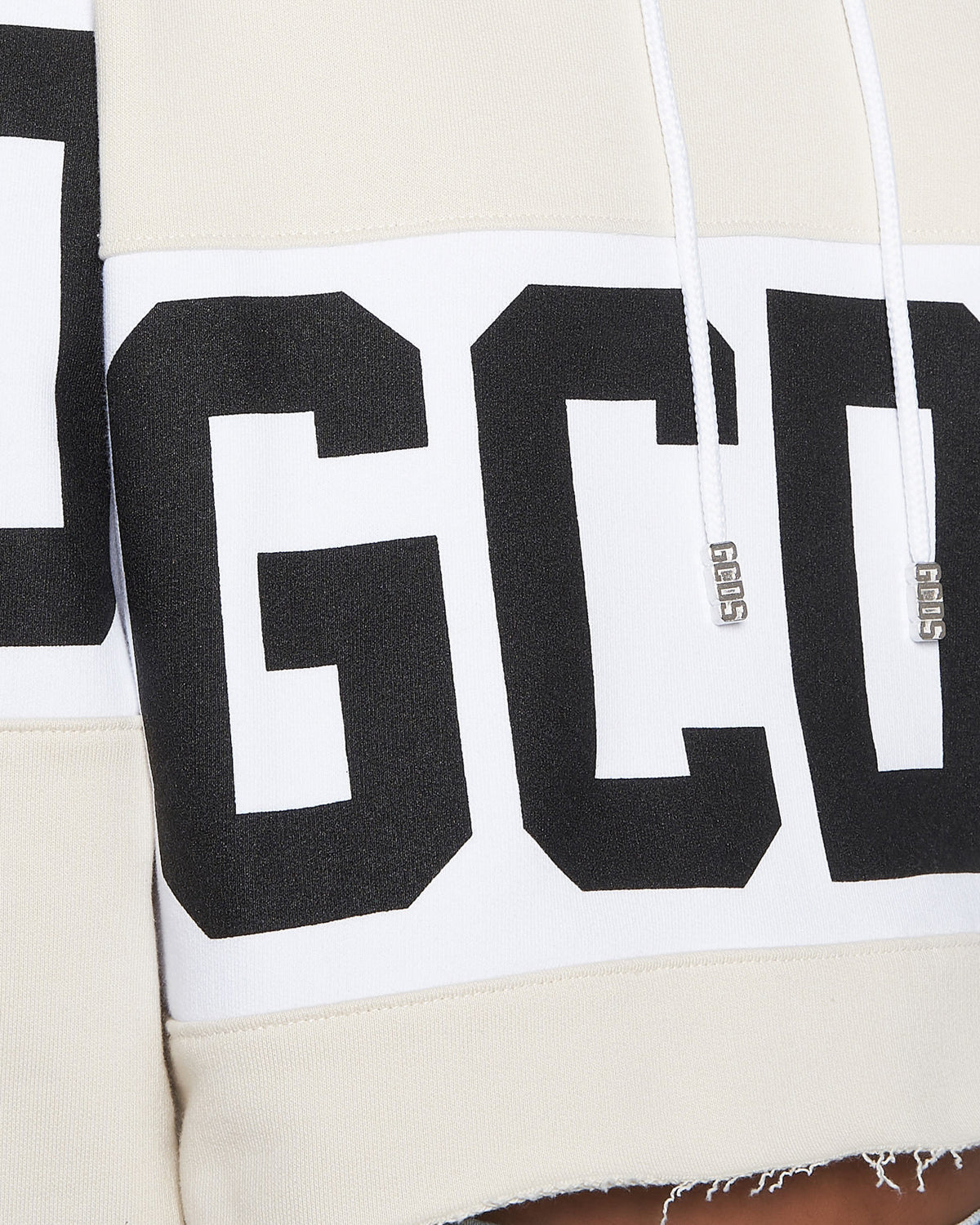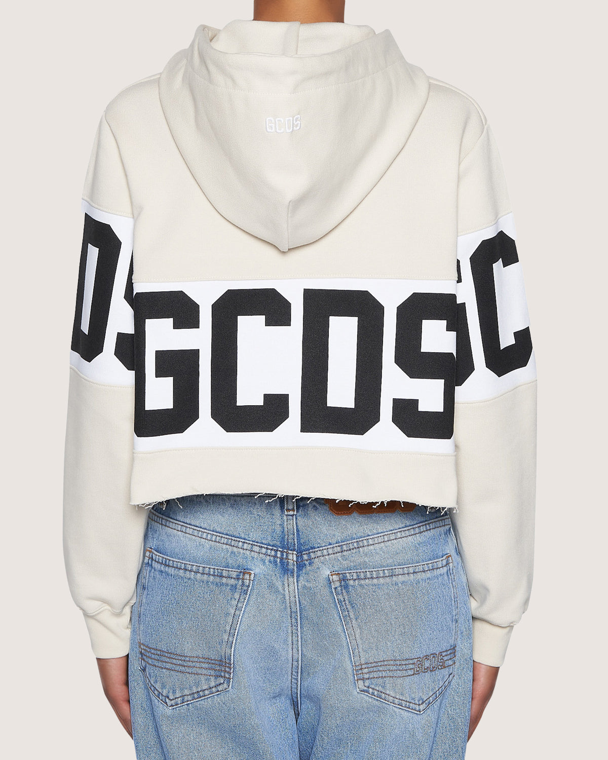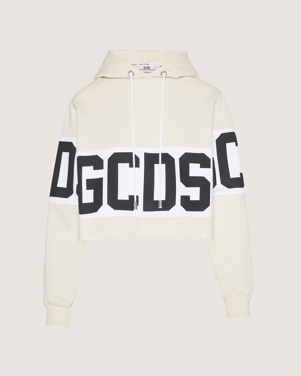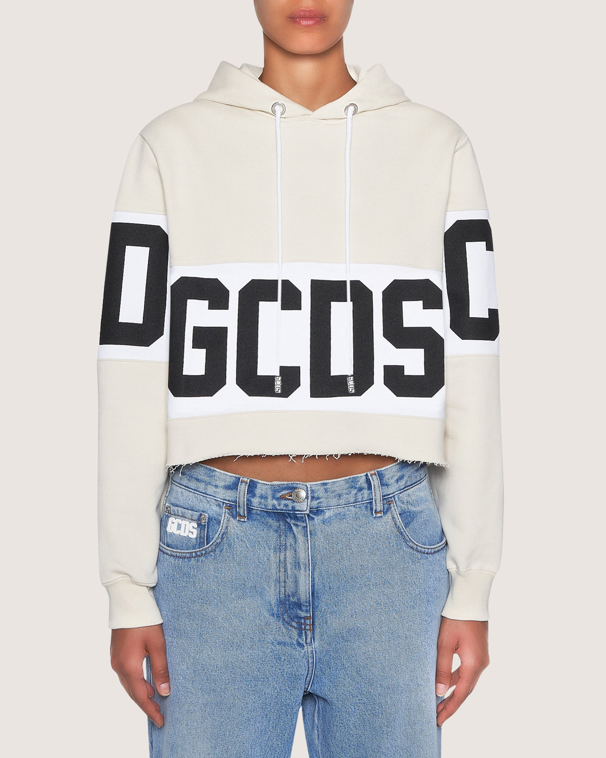 Crop hoodie with logo band. Raw cut on the bottom. Printed logo band and embroidery on hood.