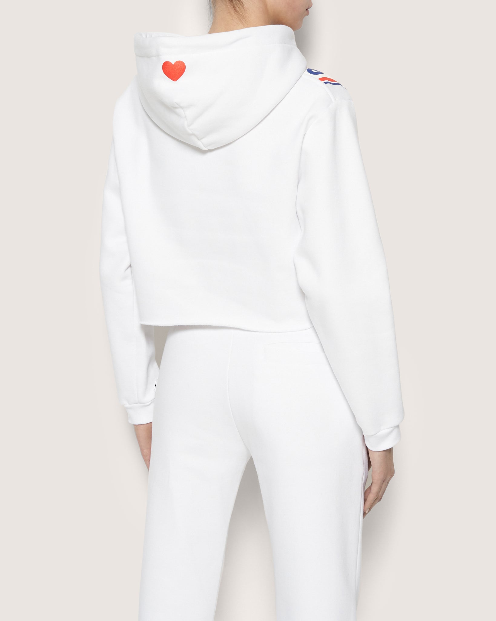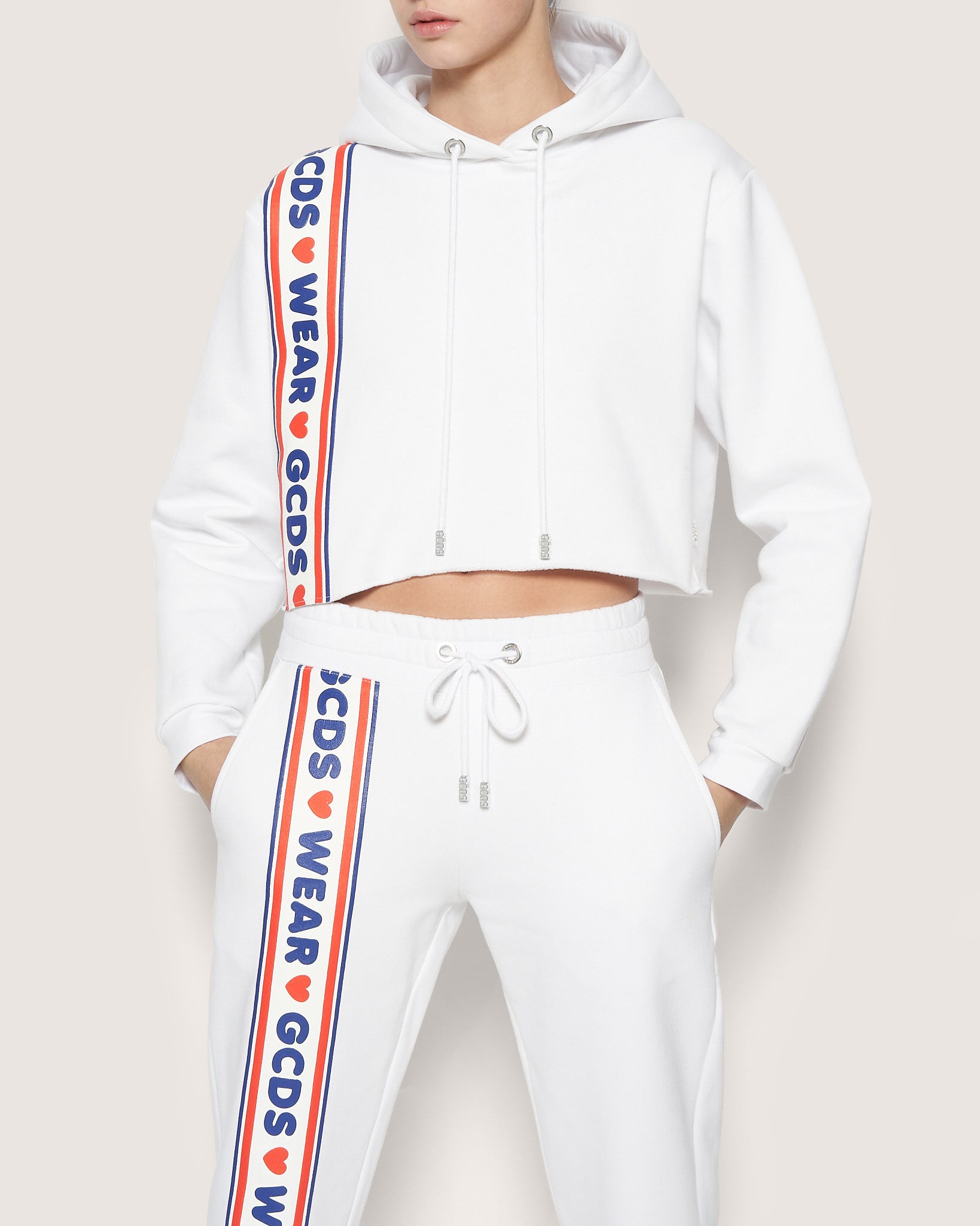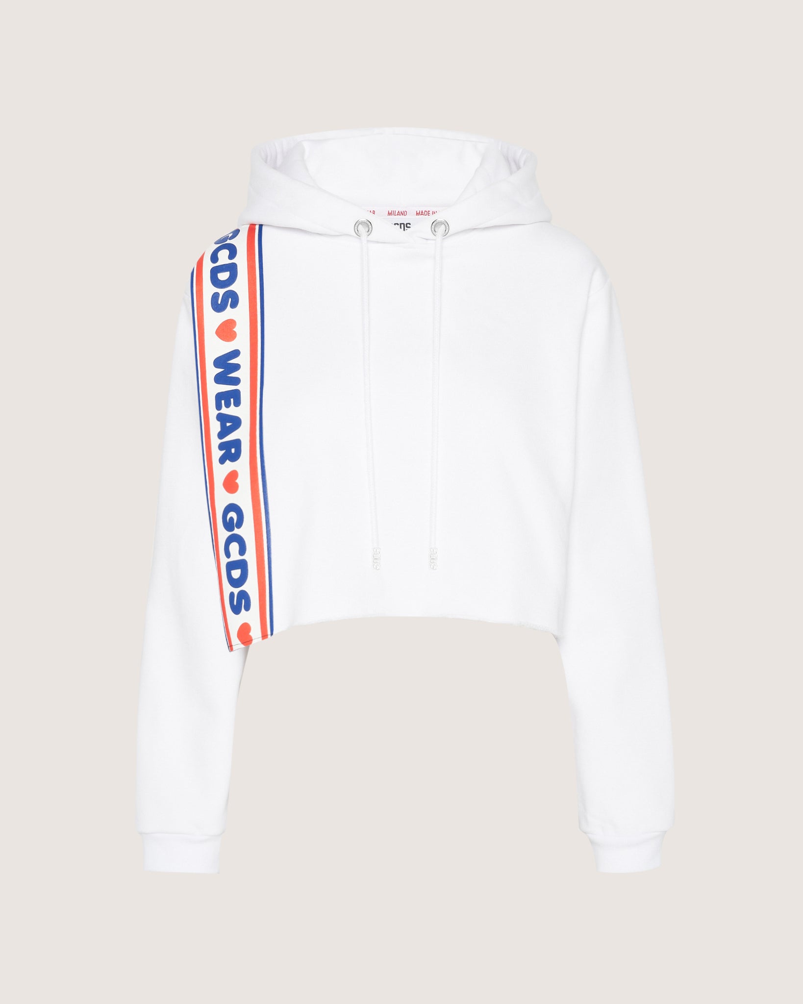 Raw-cut cropped GCDS sweatshirt and long sleeves. Adjustable hood with drawstring and cord clamp. 3D heart printed on the hood and 3D GCDS Wear Cute logo band along the side.