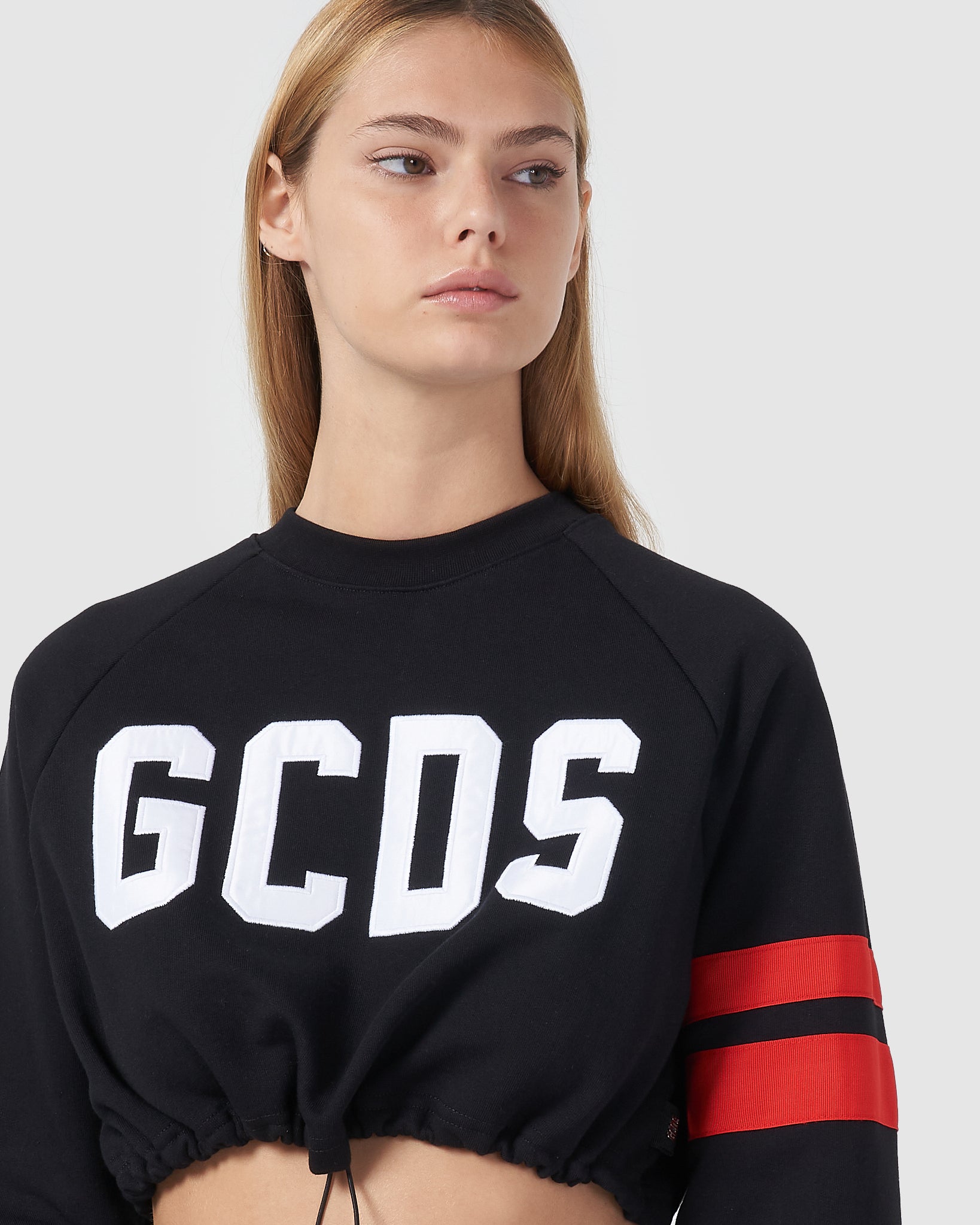 GCDS long-sleeved cropped raglan cut crew neck with adjustable cord tie at the bottom. Contrasting satin logo appliquéd with cording on the center front. Double grosgrain band on the left sleeve.