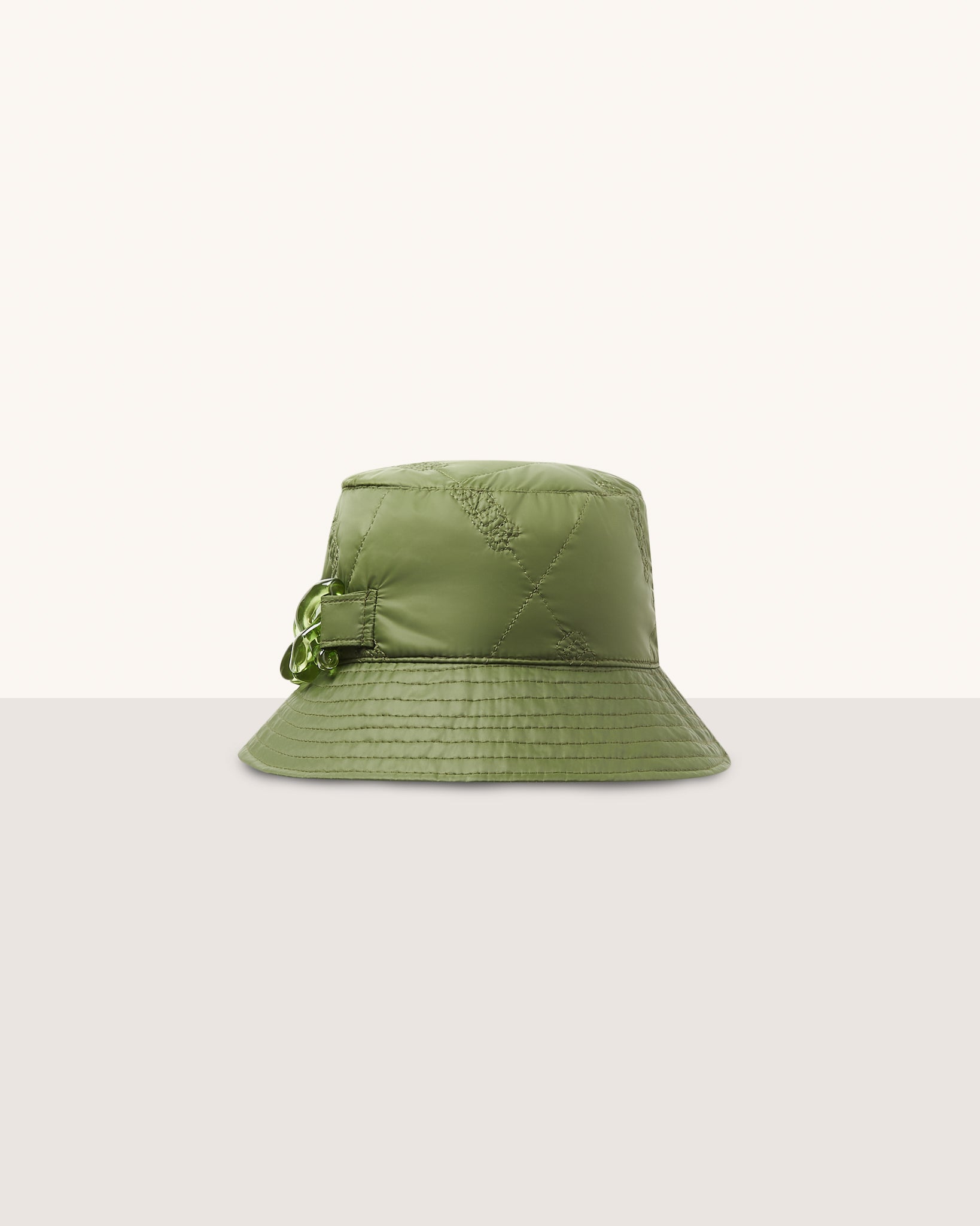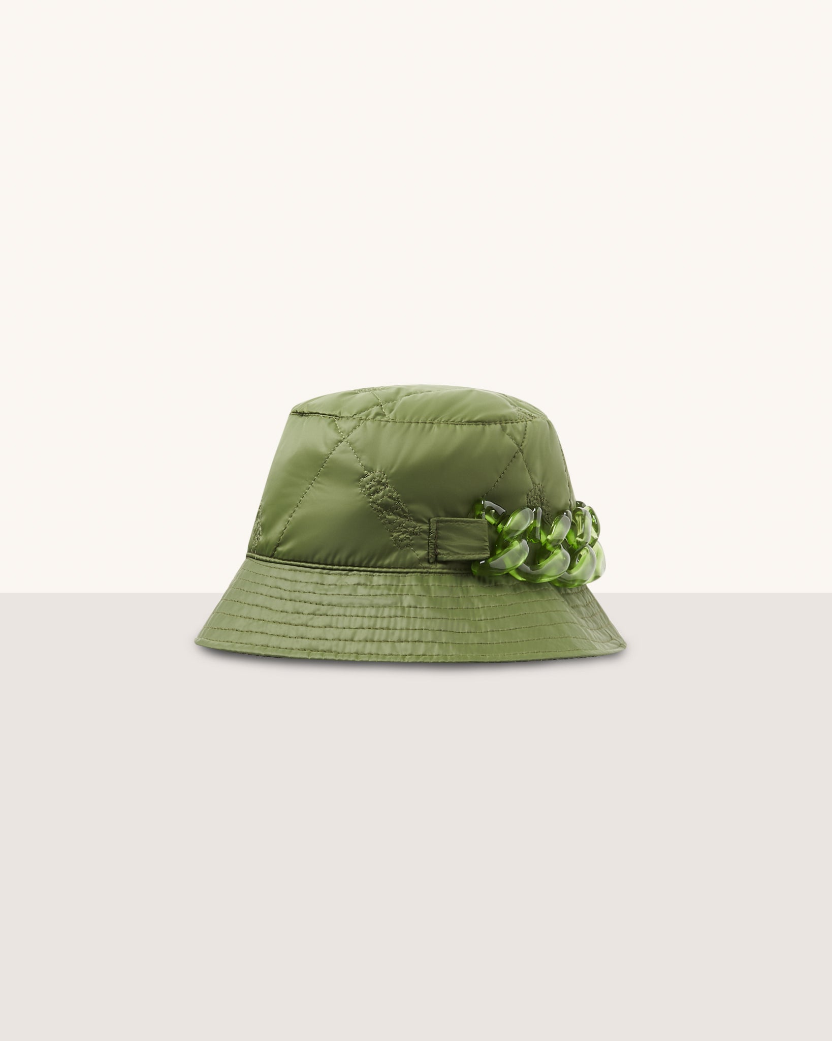 GCDS fisherman hat, in quilted nylon with logo and transparent green ABS maxi GCDS logo chain. Inside of the brim is made of contrasting vinyl.
