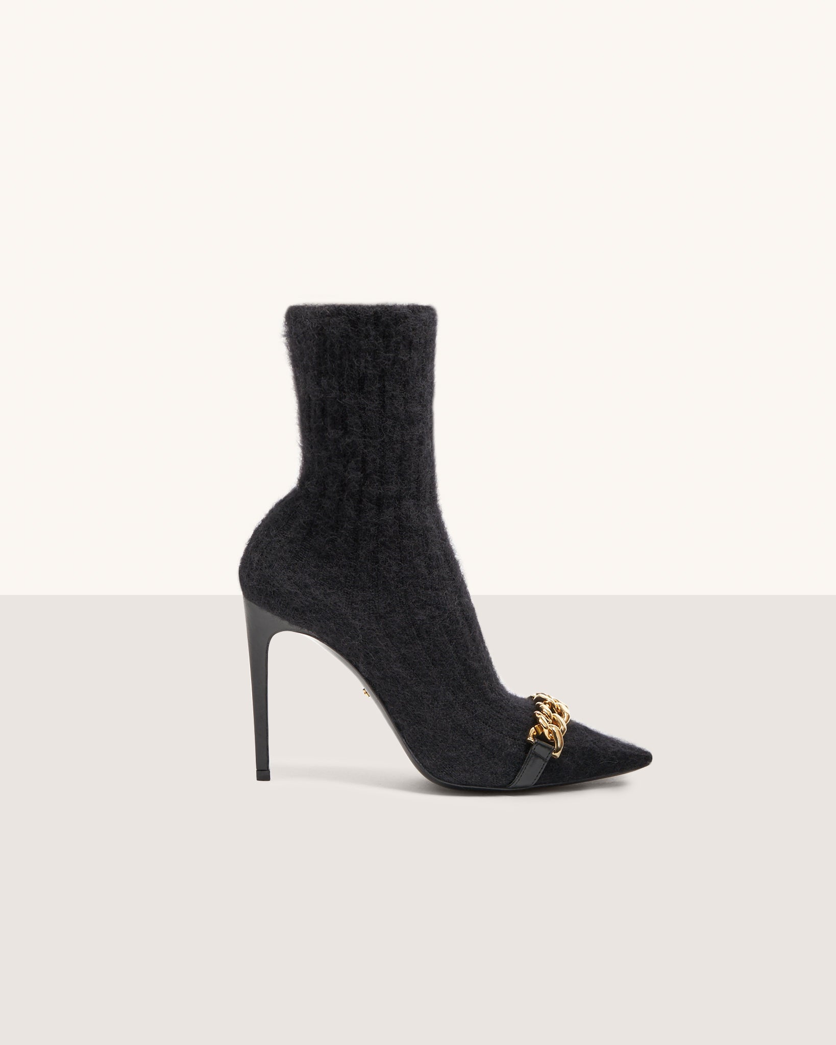 Stiletto GCDS ankle boots, soft carded mohair. On the front, iconic golden GCDS logo chain. Calf Height.