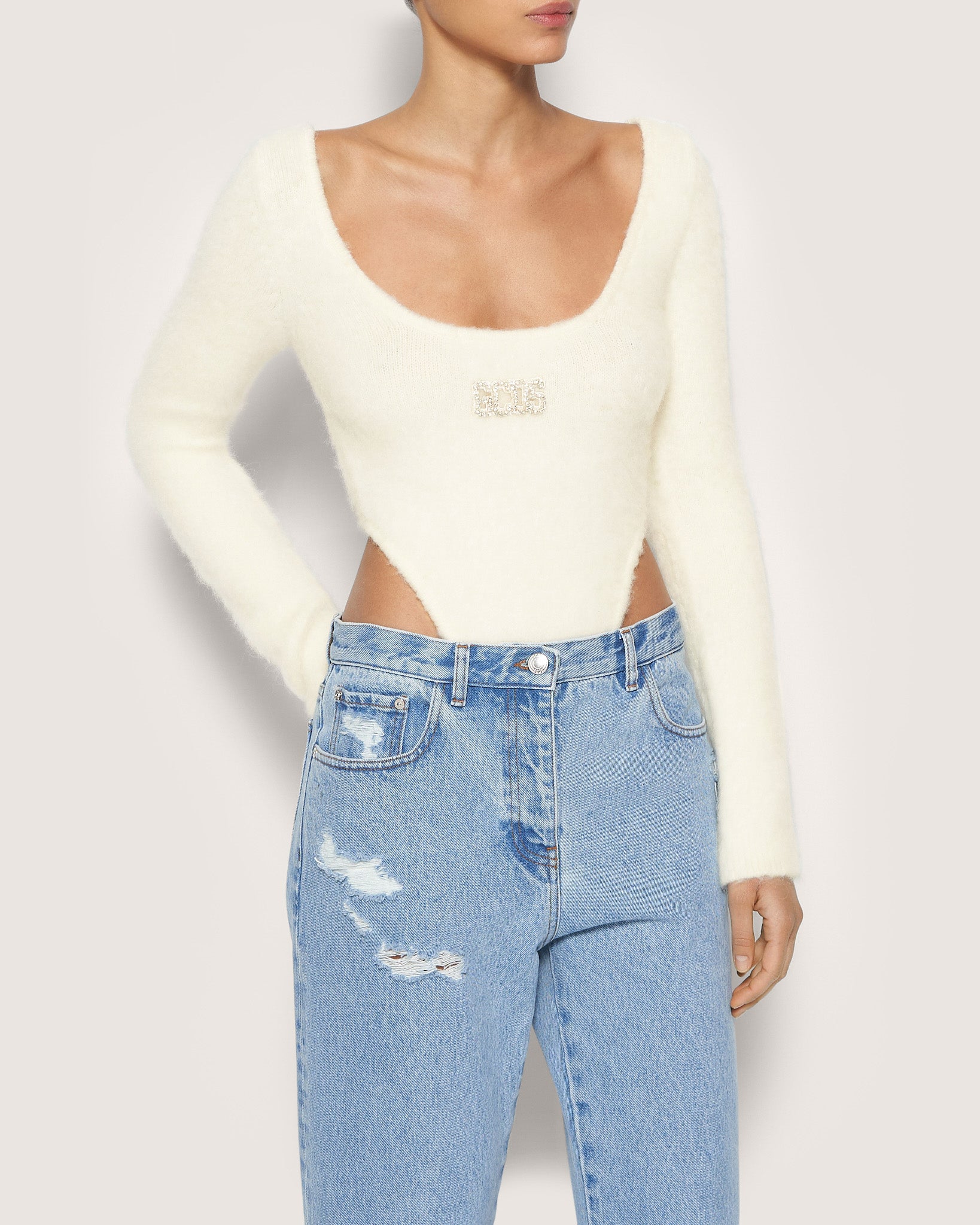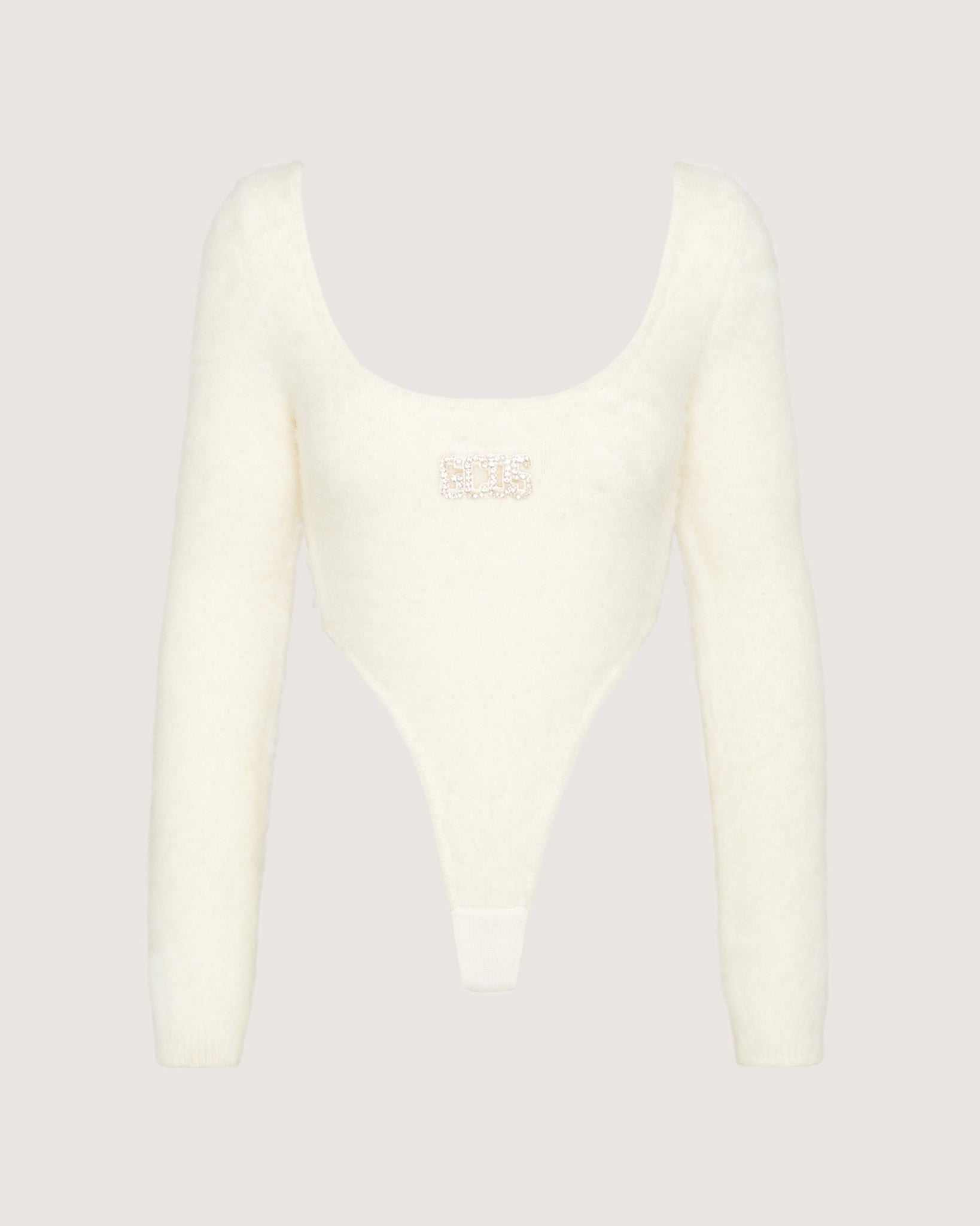Mohair long-sleeved GCDS bodysuit with ribbed insert on the bottom. Very high cut over the hips. GCDS logo patch with crystals on center front with matching colored cord. Slightly boxy neckline.