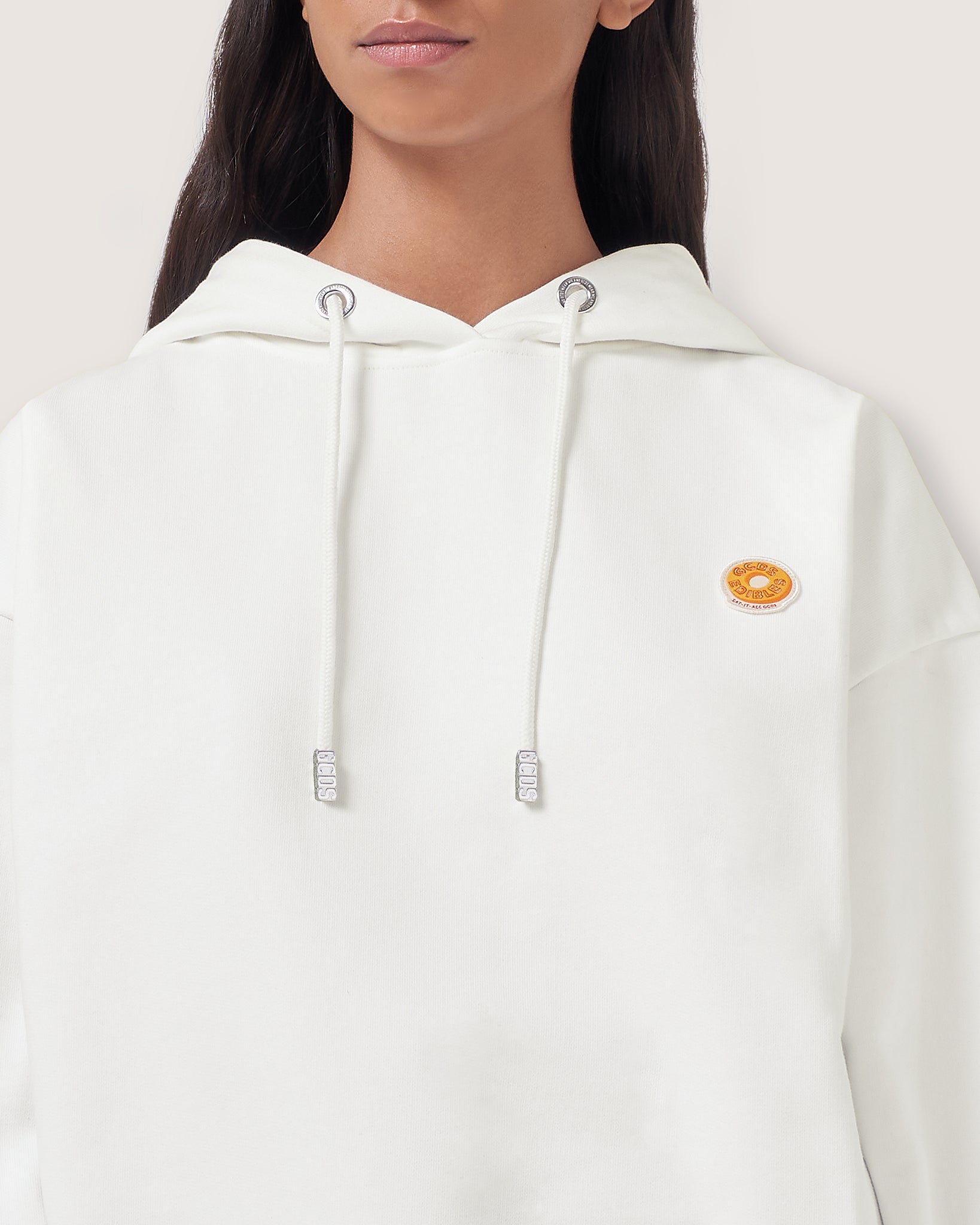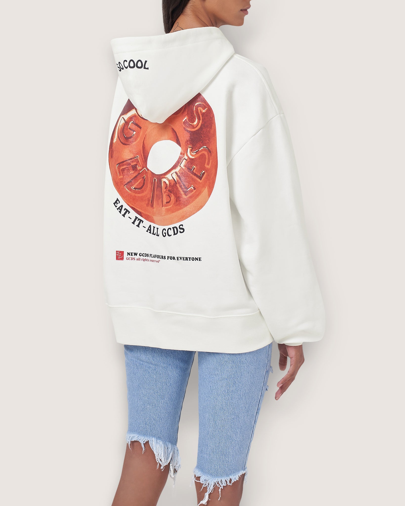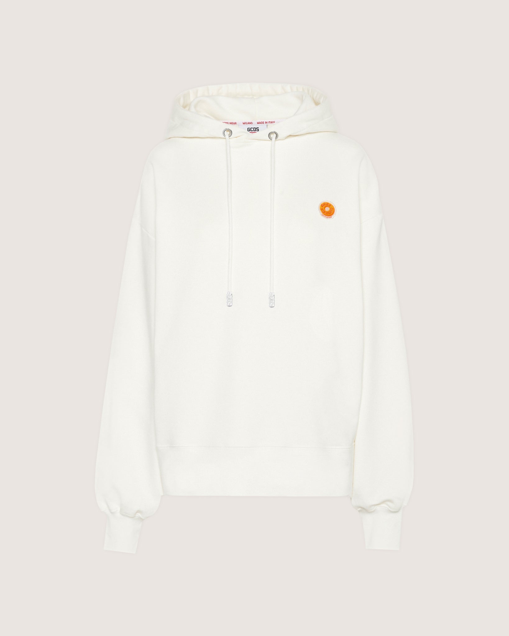 Long sleeves GCDS sweatshirt, adjustable hood with drawstring and cord clamp. Patch on the front and shiny print on the back. "So Cool" printed on the hood. Over-sized.