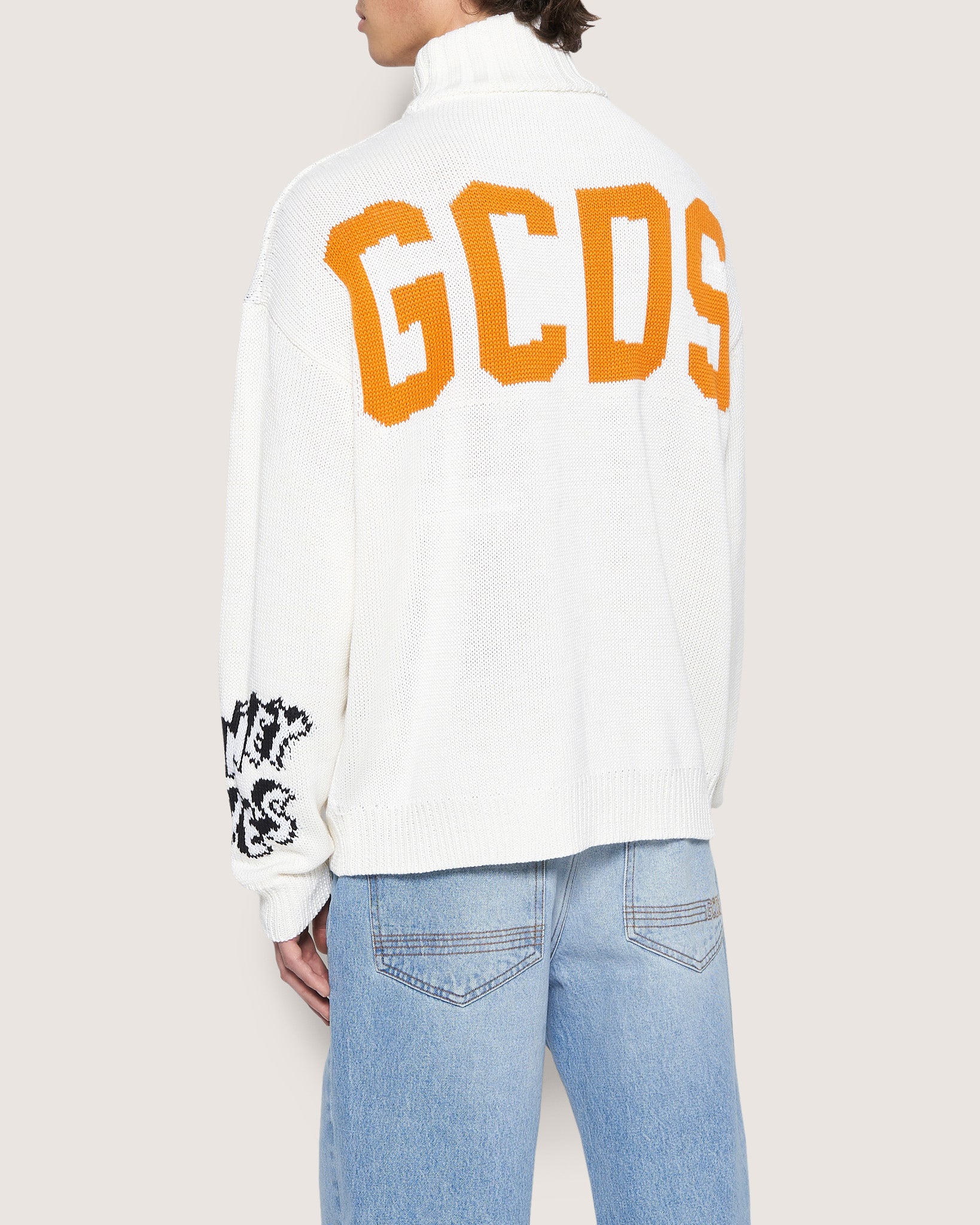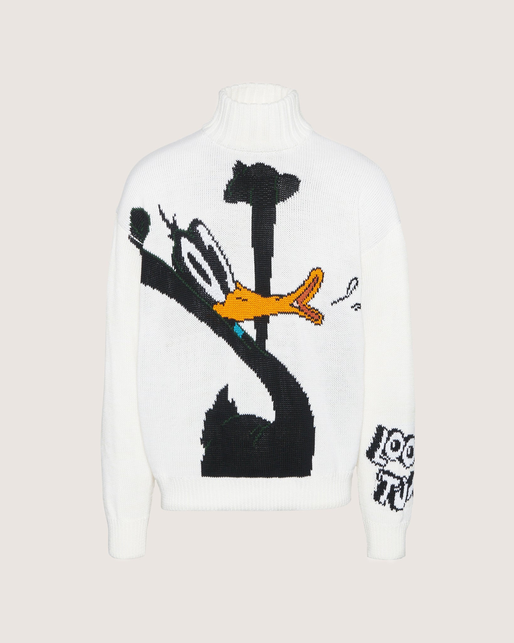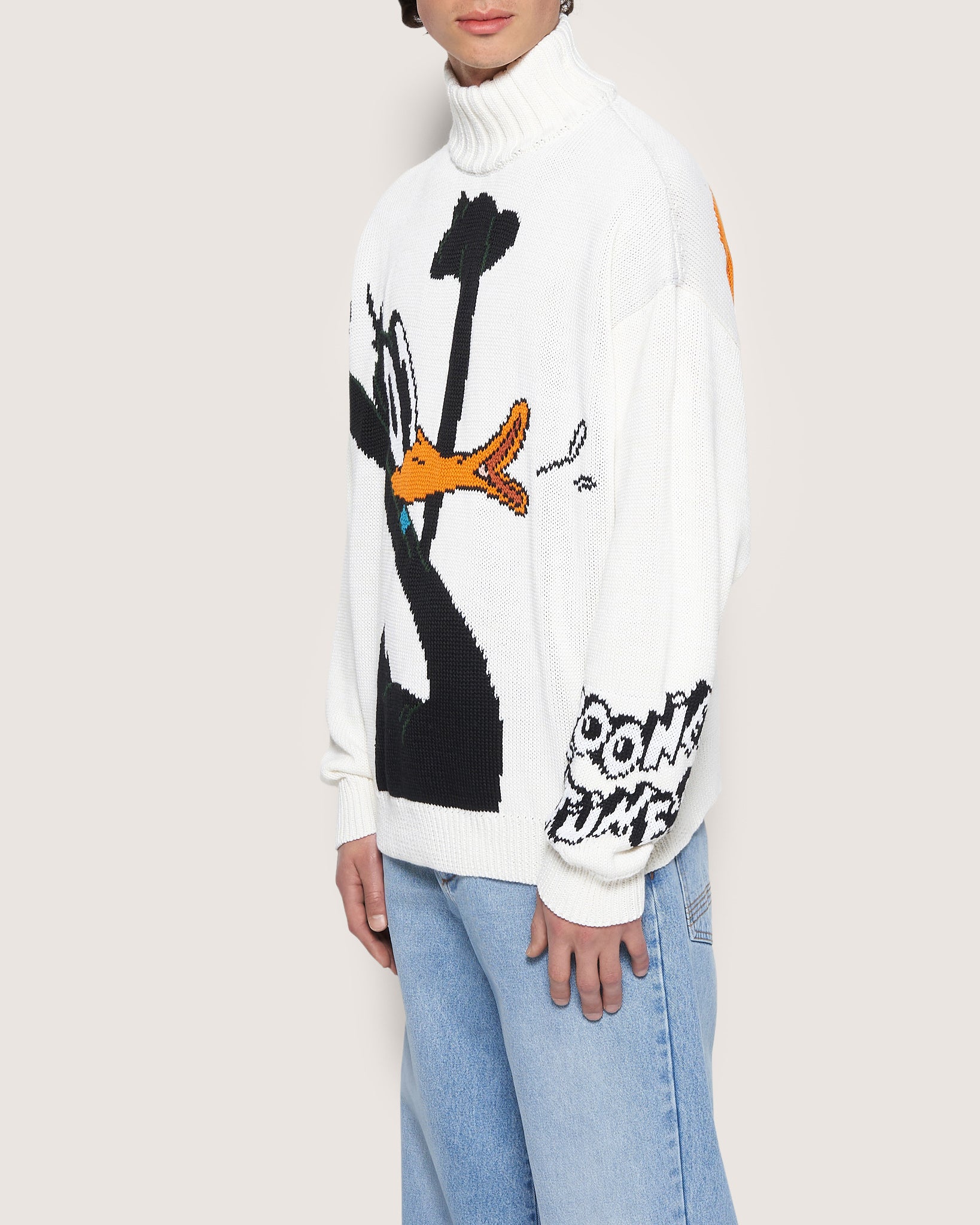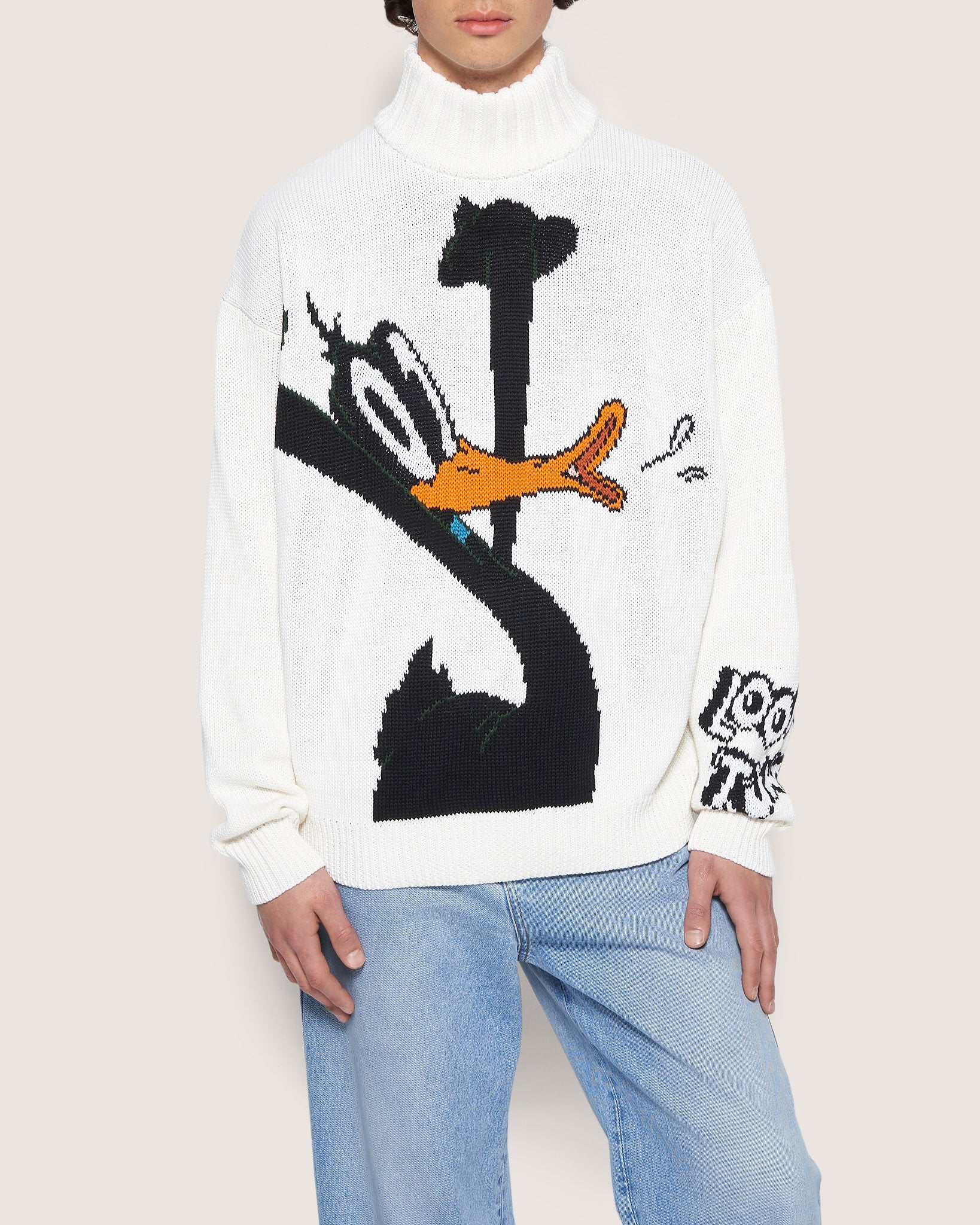 Jersey knit, high-necked GCDS sweater, from the seasonal Looney Tunes collection. Maxi Daffy Duck inlay on the front, and inlaid Looney Tunes logo on the sleeve. On the front, inlaid GCDS logo. Over-sized.