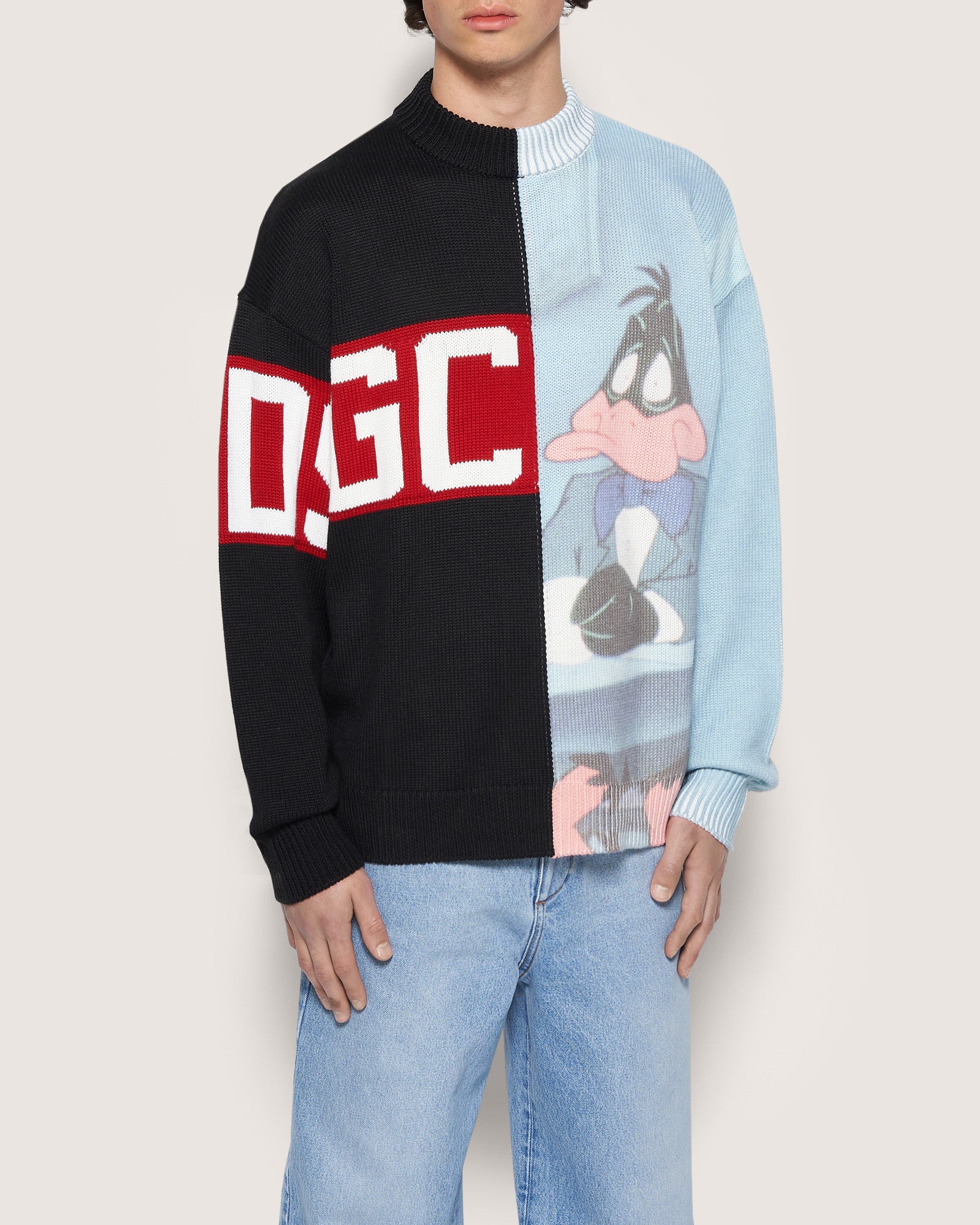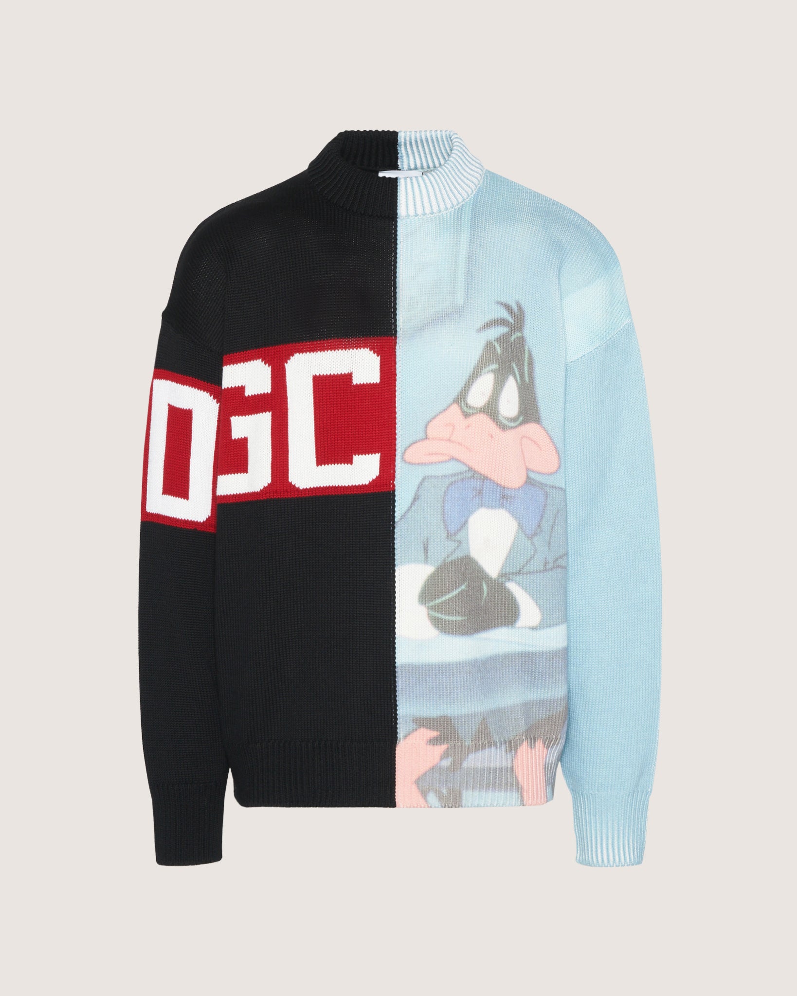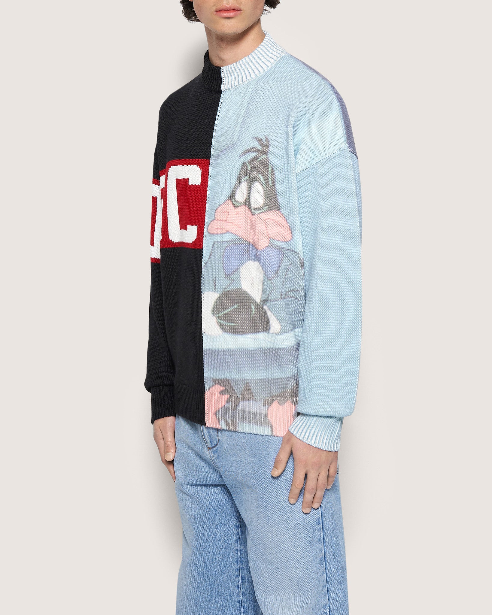 Jersey GCDS sweater. Right half is reminiscent of the iconic GCDS sweater with logo band. Left half, in jersey knit with a washed-out print, comes from the seasonal Looney Tunes collection. Regular fit.
