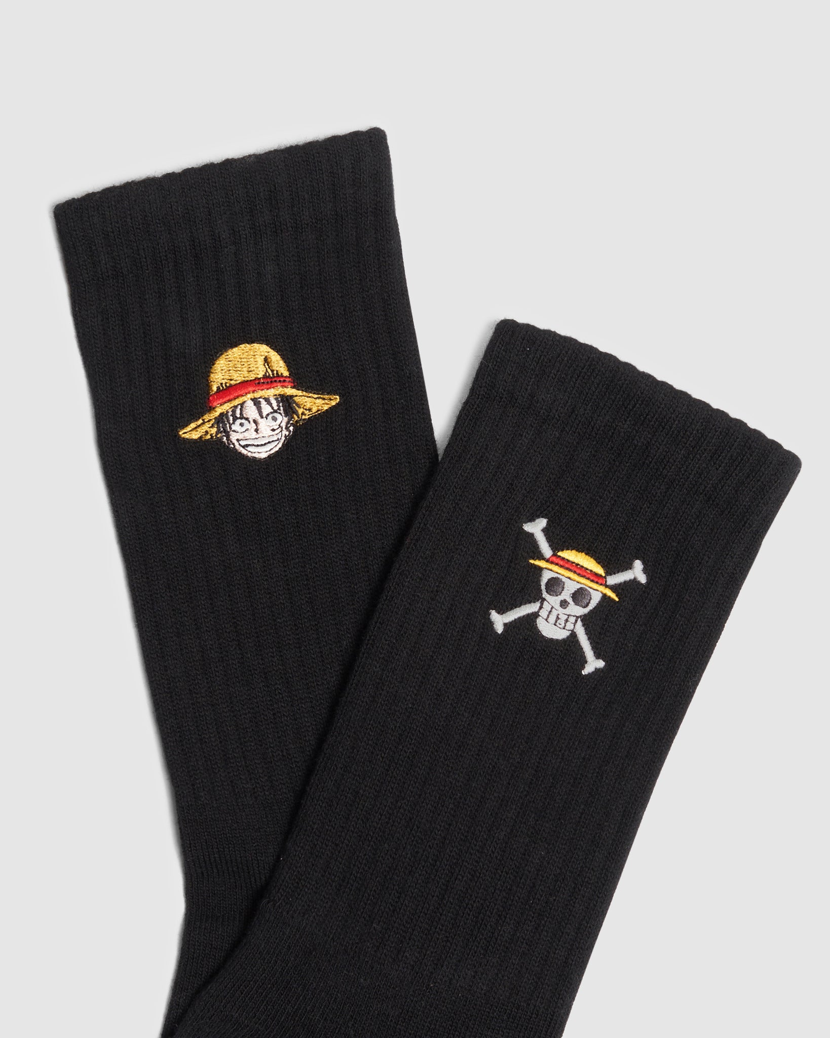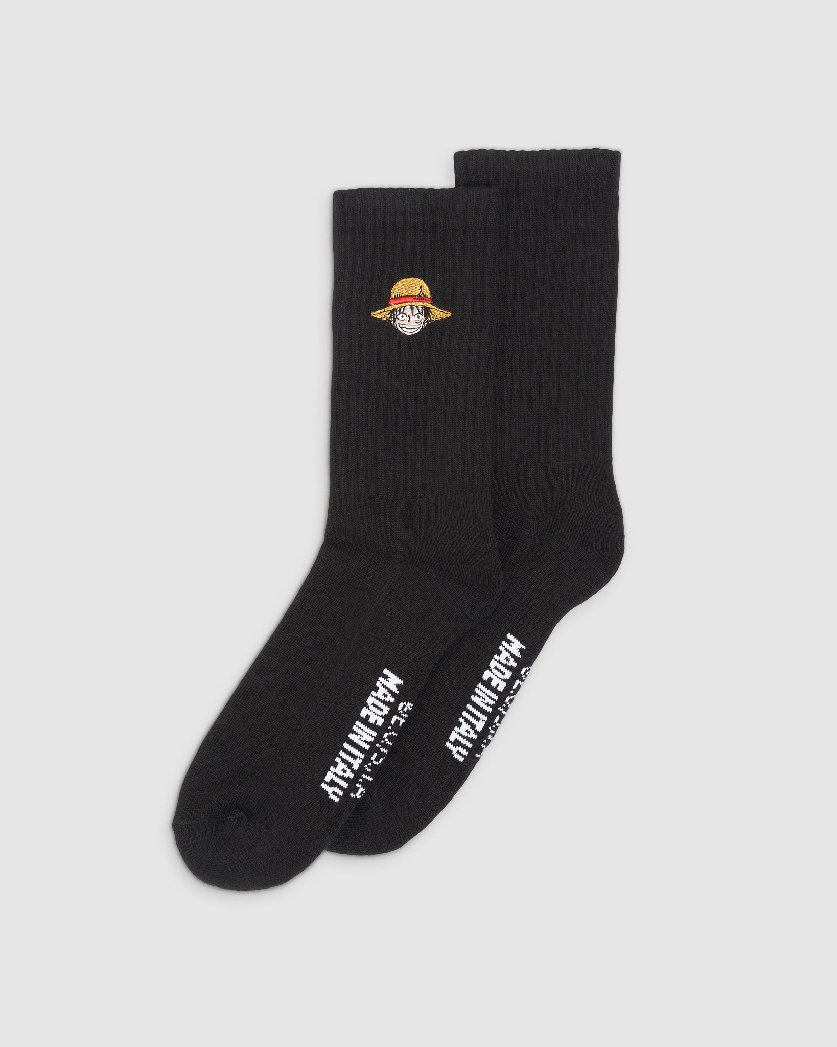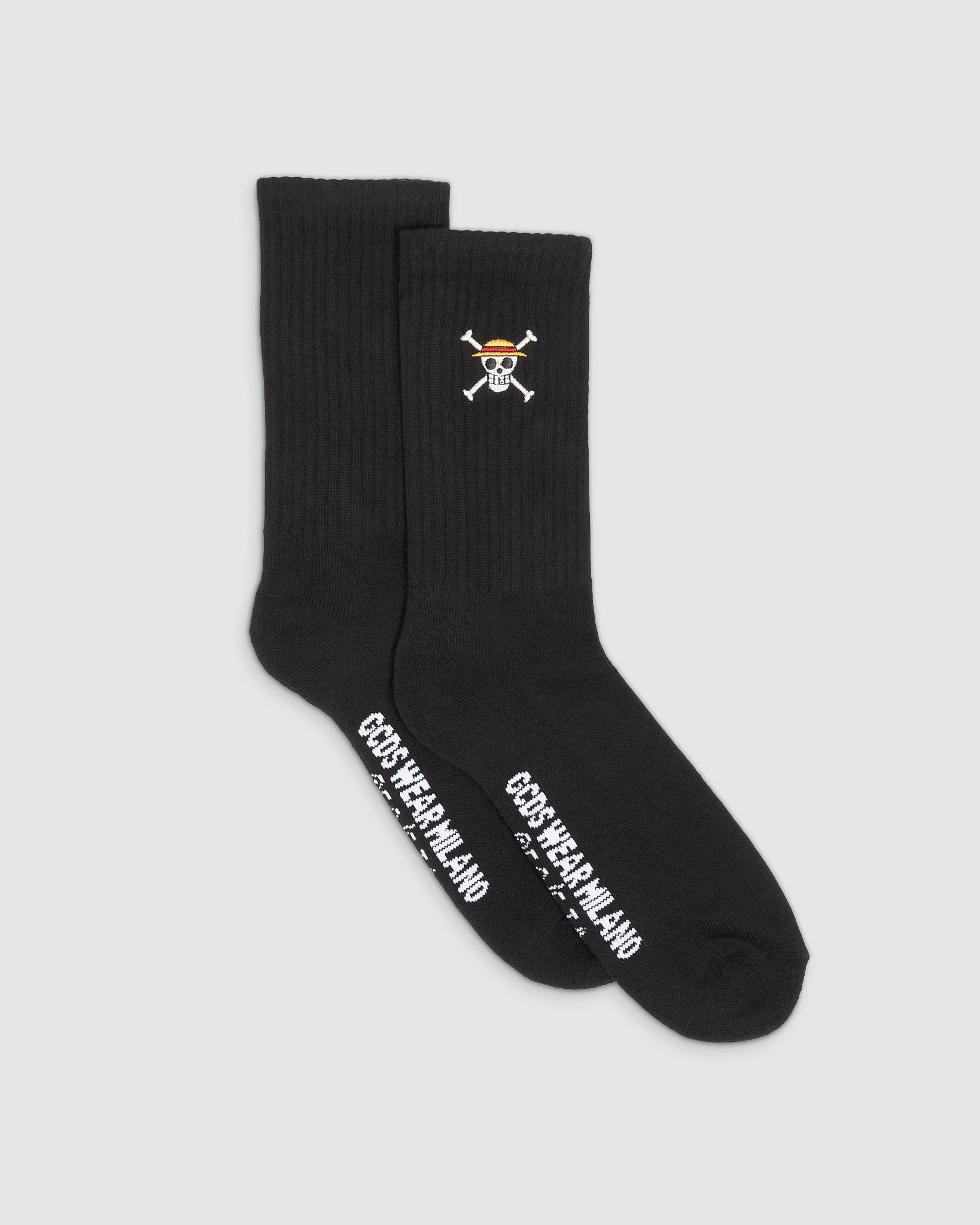 GCDS socks in cotton blend from the seasonal collab, with embroidered Mugiwara characters Luffy and Jolly Roger.