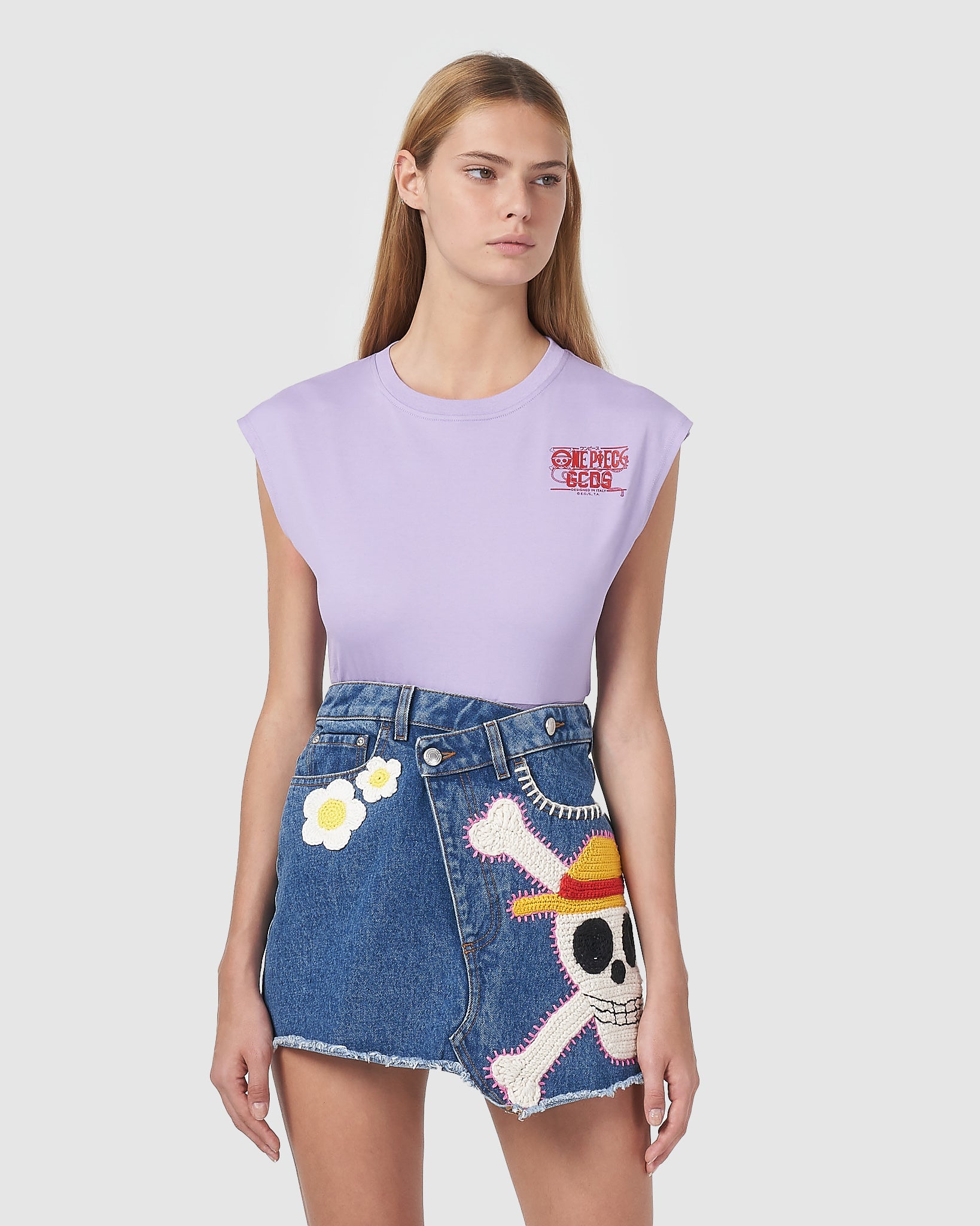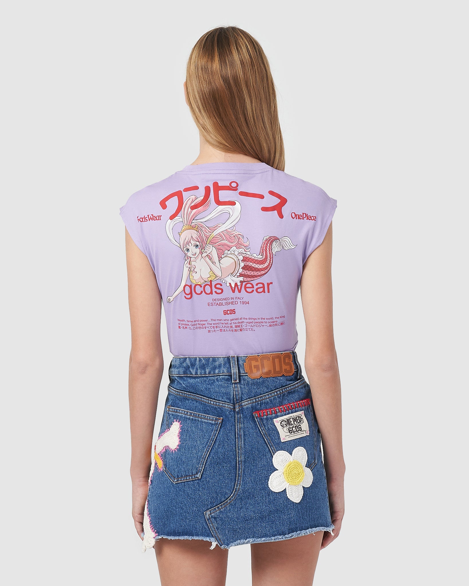 GCDS cotton bodysuit from the seasonal collab with exclusive One Piece x GCDS print logo at pocket height. On the back, Shirahoshi silk-screen print. From the waist down, stretch cotton narrow rib.