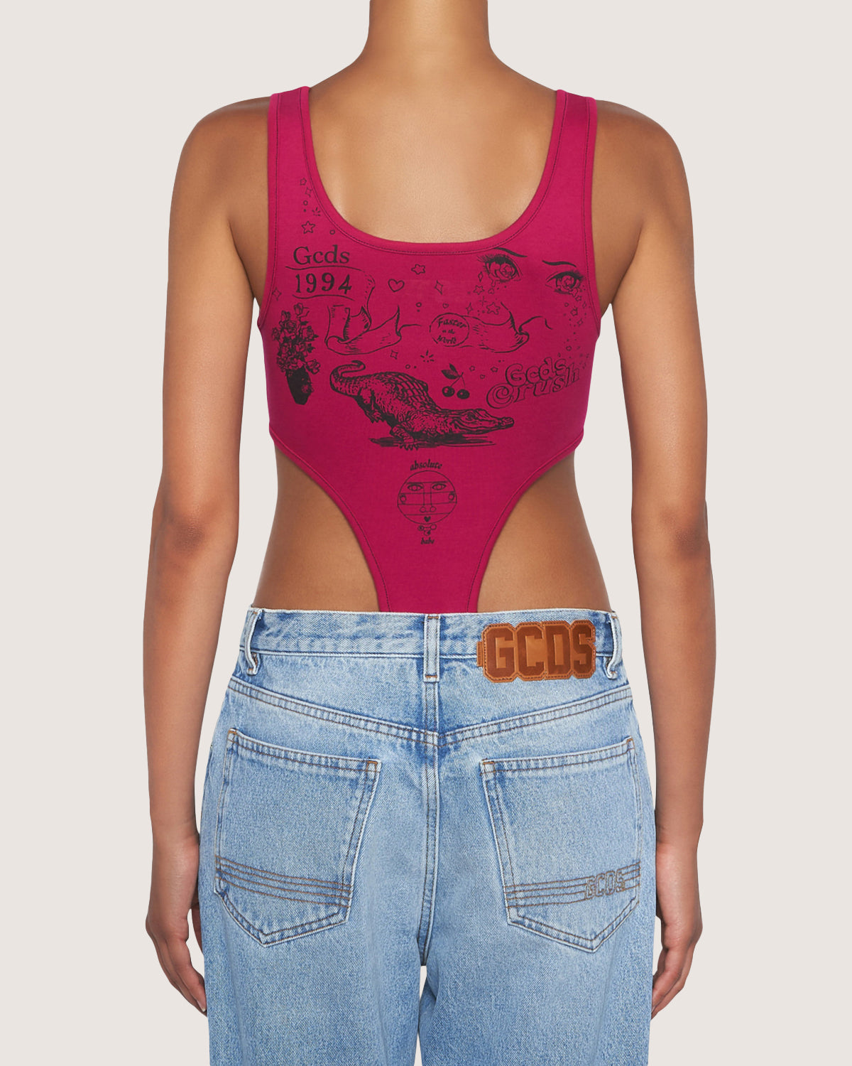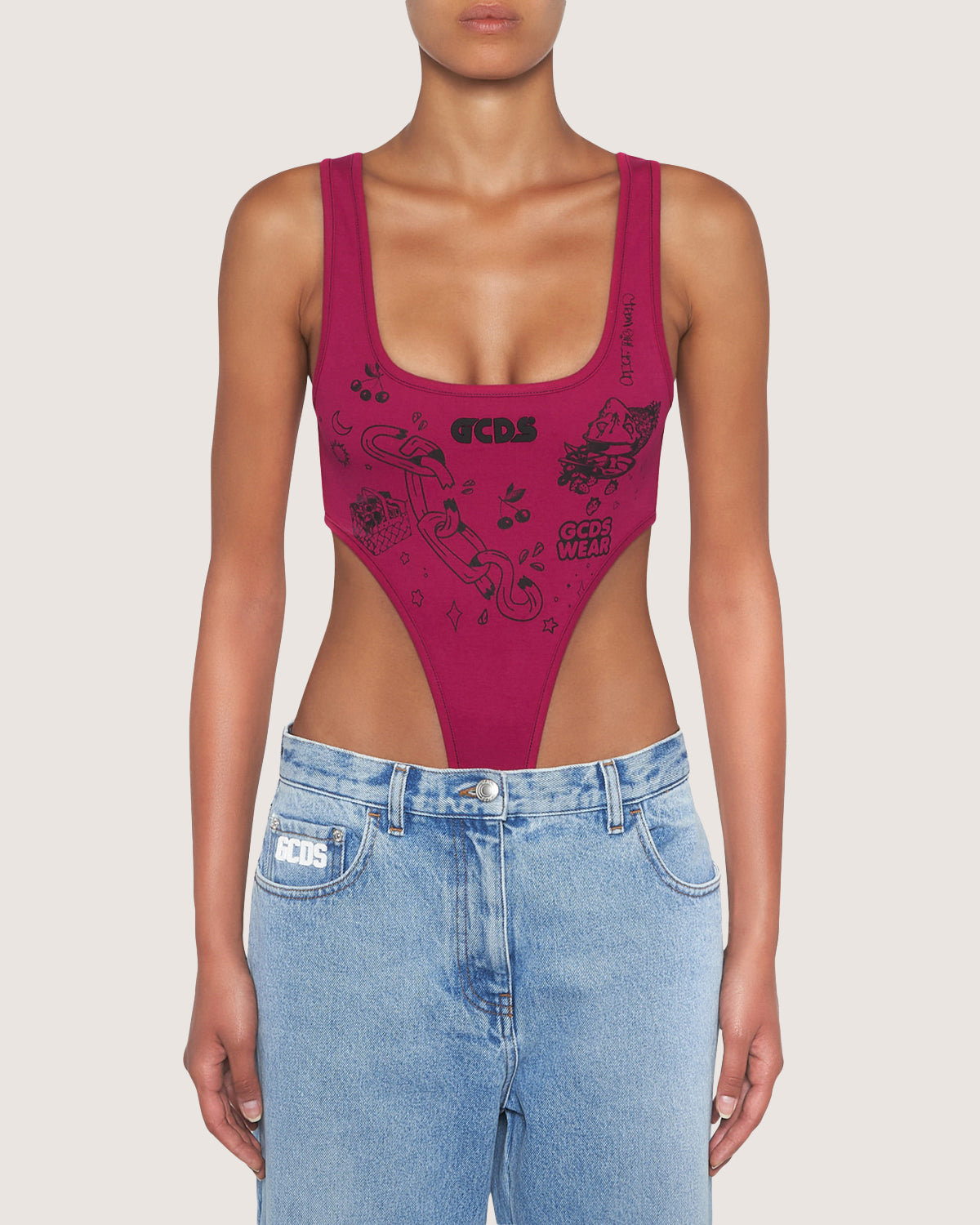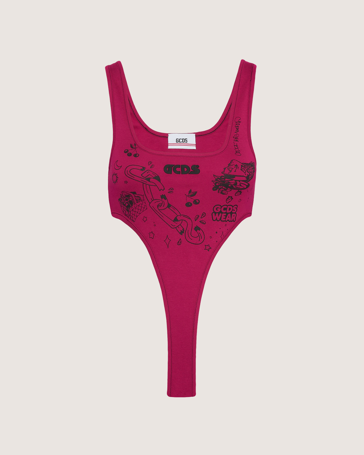 Cotton bodysuit with square neckline and wide leg. Bottom closure with automatic buttons. Contrasting seams. Graphic print placed on front and back. Contrasting rubberized logo patch applied on the center front.