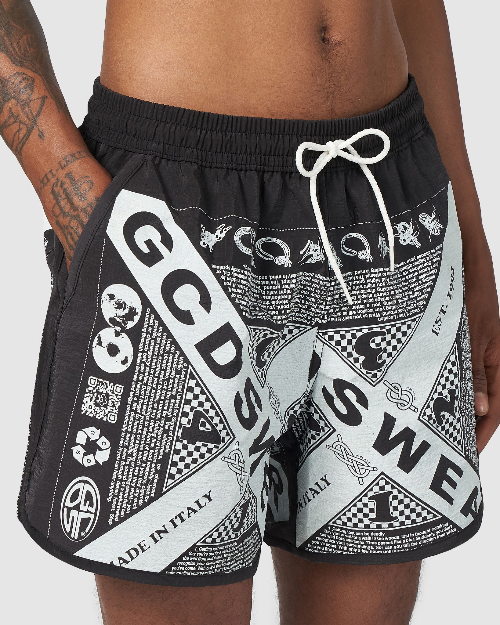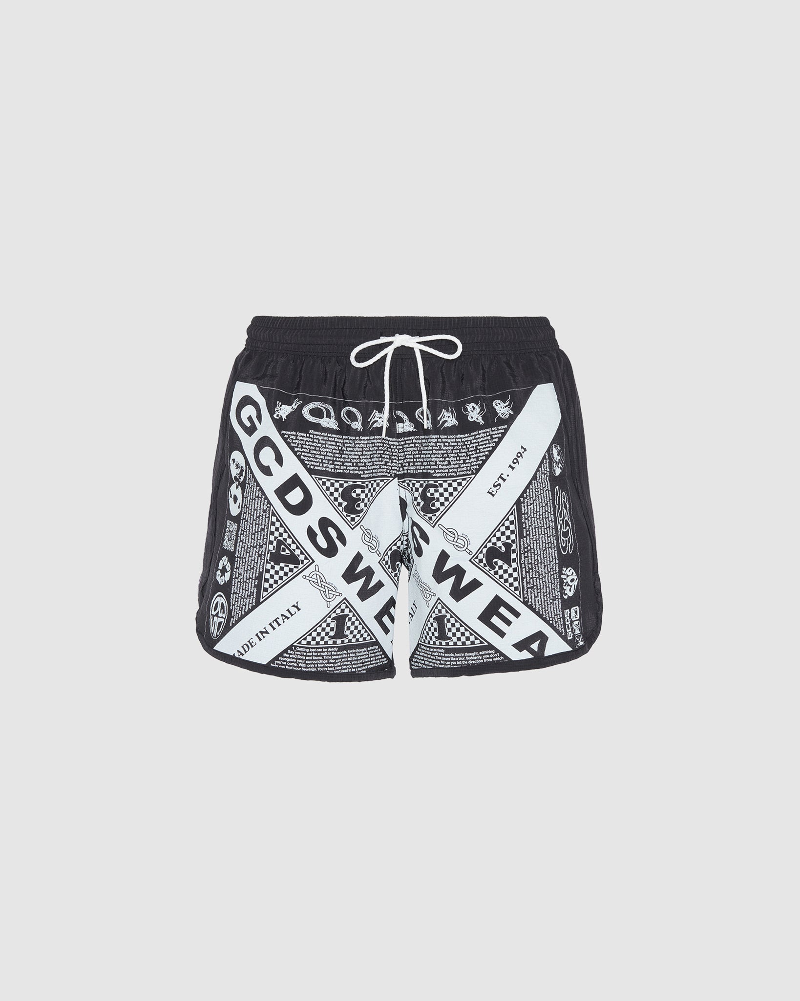 Running-style GCDS swim shorts in Rip-stop fabric, with curved hem and fabric trim. Glow-in-the-dark Survival Bandana motif print. Slash pockets. ELastic waistband with drawstring. Rear Velcro pocket.