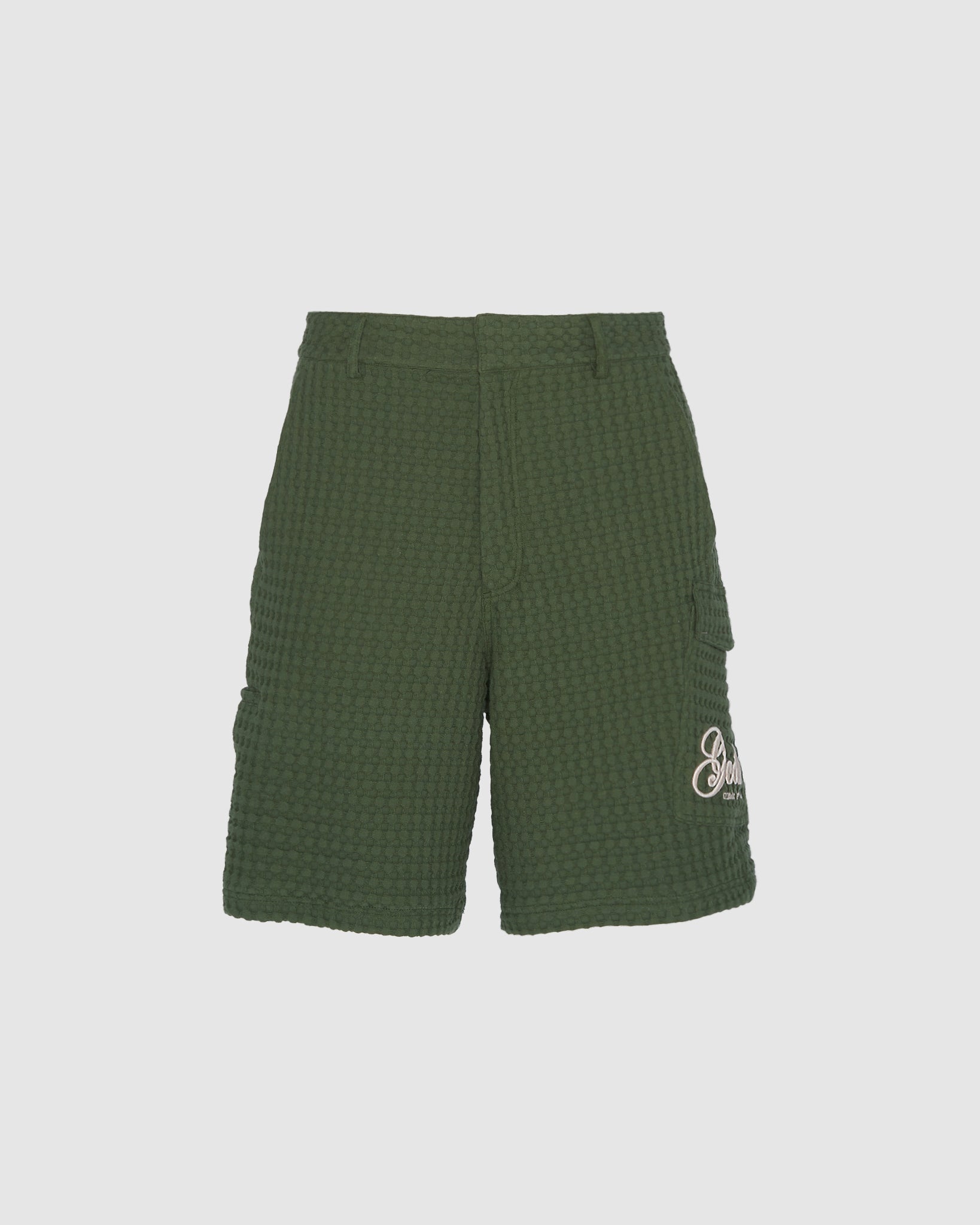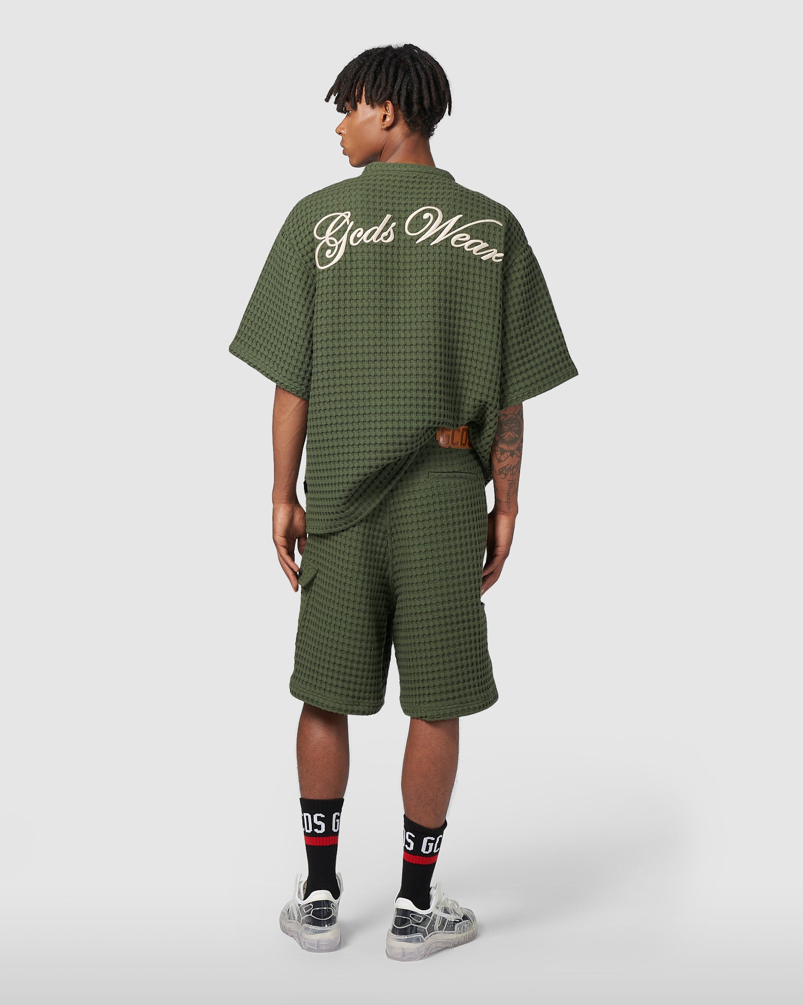 Waffled GCDS shorts. Slash pockets. Welt pockets on the right side. On the left, maxi patch pocket with 3D embroidered GCDS Wear logo. Over-sized.