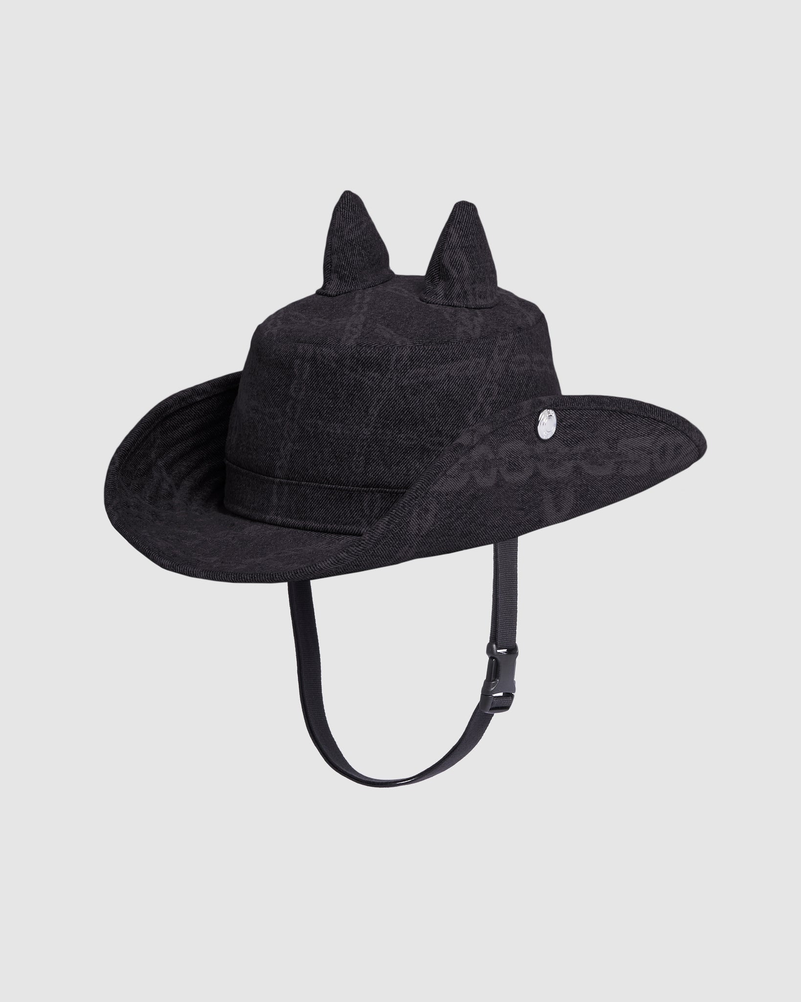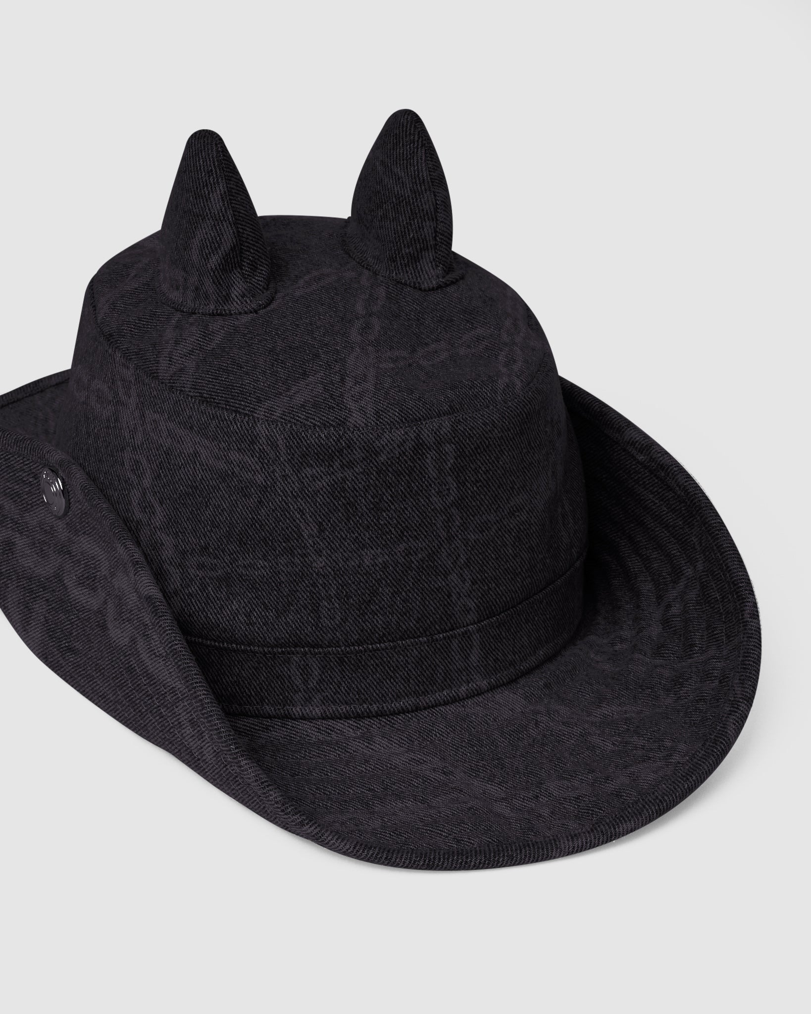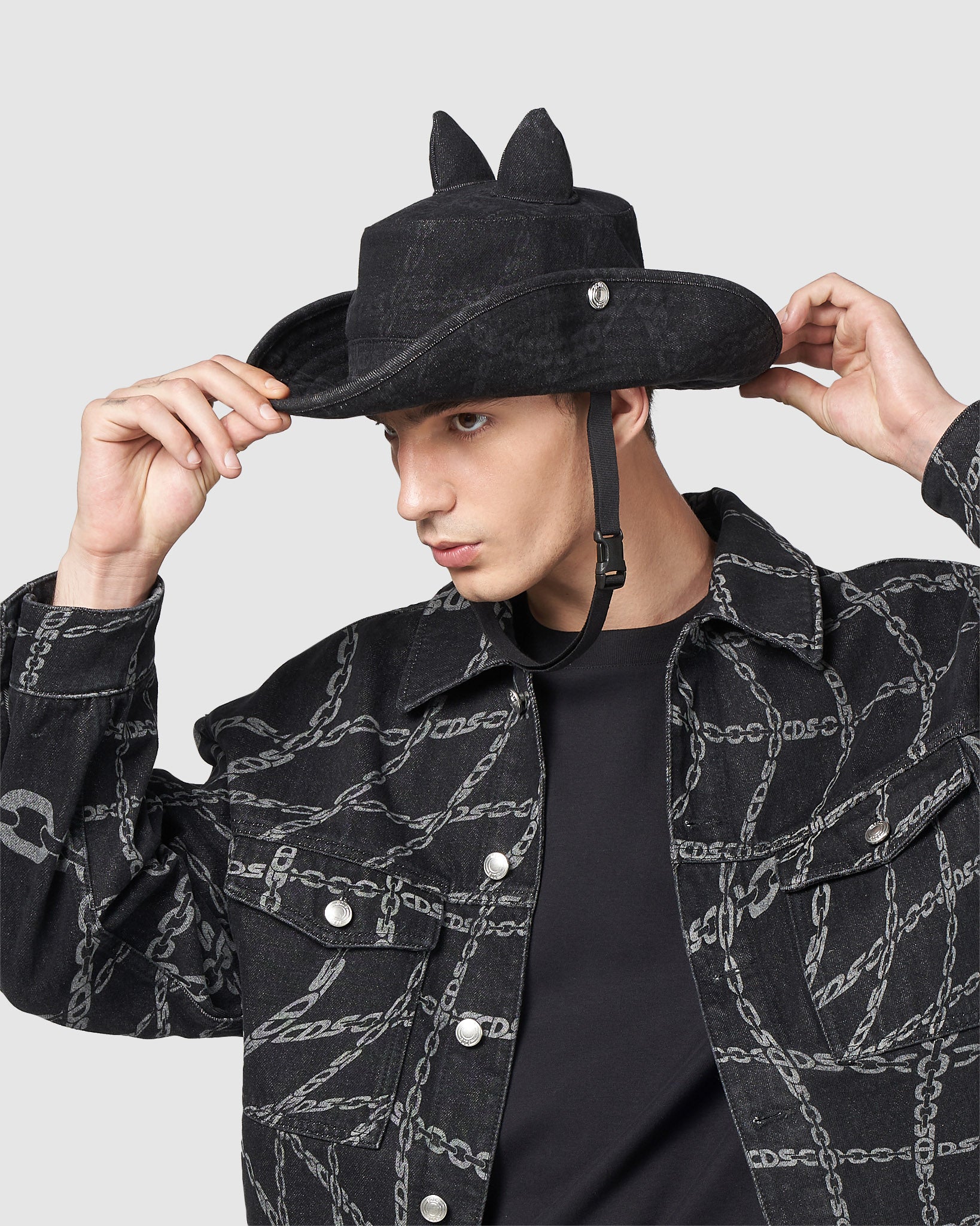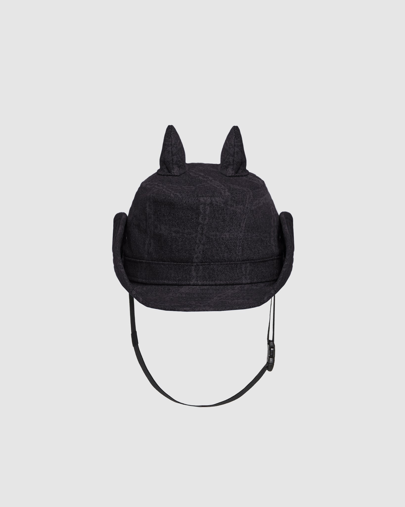 GCDS Australian hat with padded ear flaps, in light bleached effect stone washed denim. All-over extract printed logo chain design. Logo button snaps on the sides. Adjustable strap with snap buckle. Cotton lining.