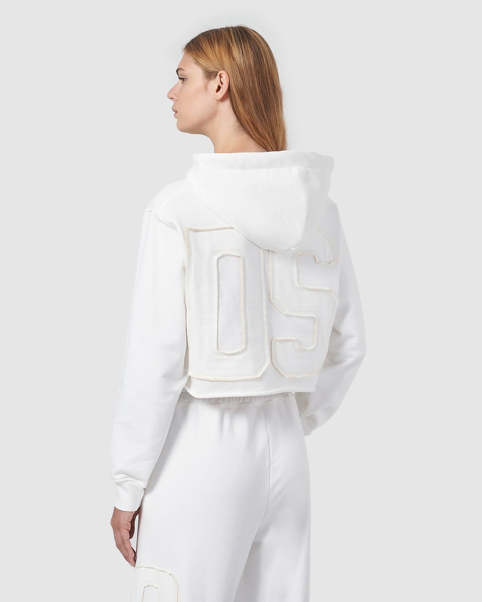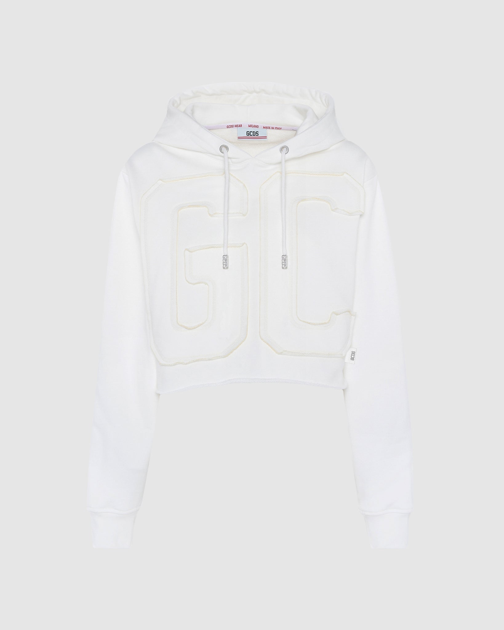 GCDS cropped long-sleeved sweatshirt with adjustable hood and raw-cut at the bottom. Frayed-cut logo lettering appliquéd with matching topstitching on the front and back. Logo print detail with polished 3D effect on the hood.