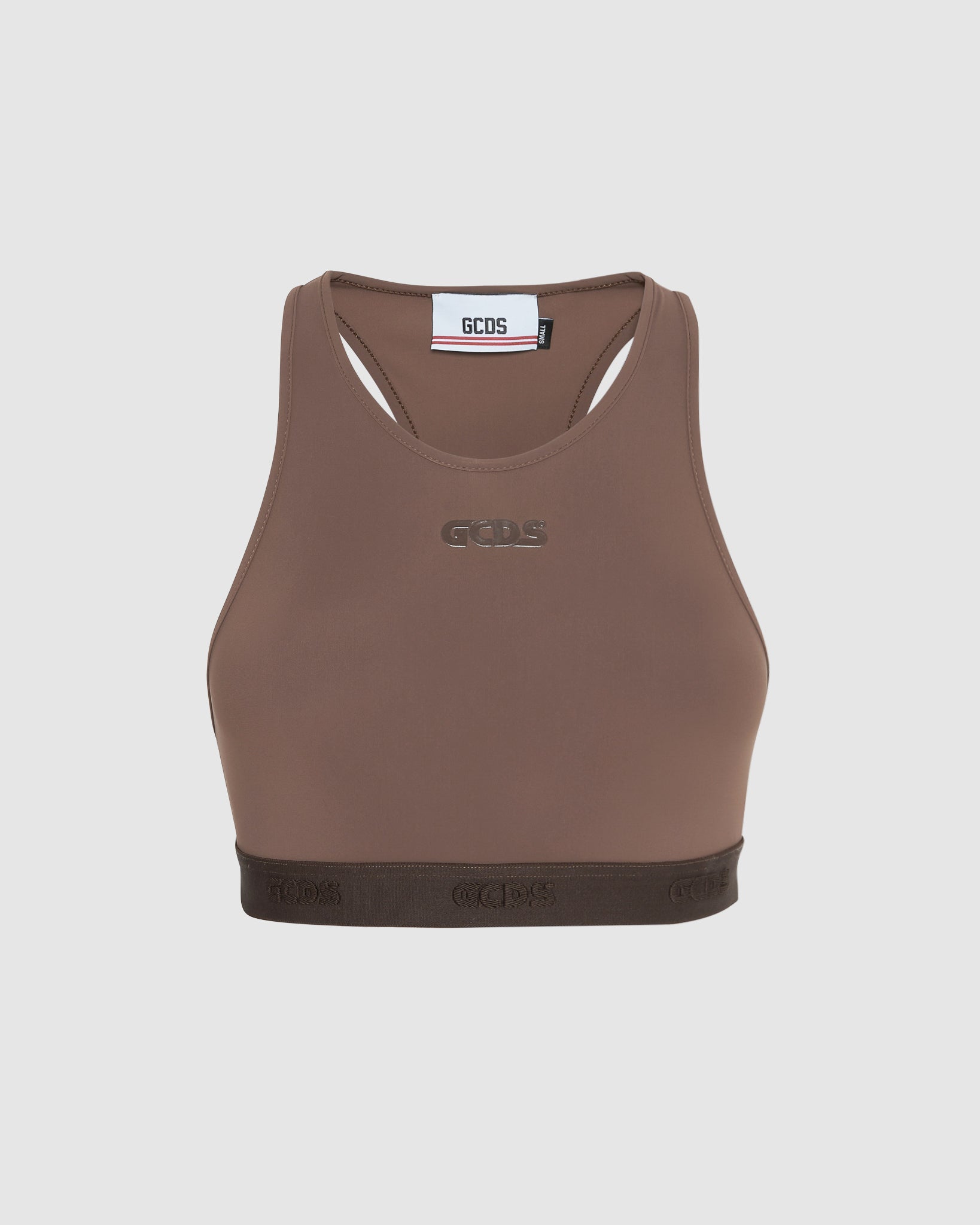 GCDS Lycra sports top with racer back for greater freedom of movement. Elastic logo on the bottom. On the center front, matching wet effect GCDS logo print.