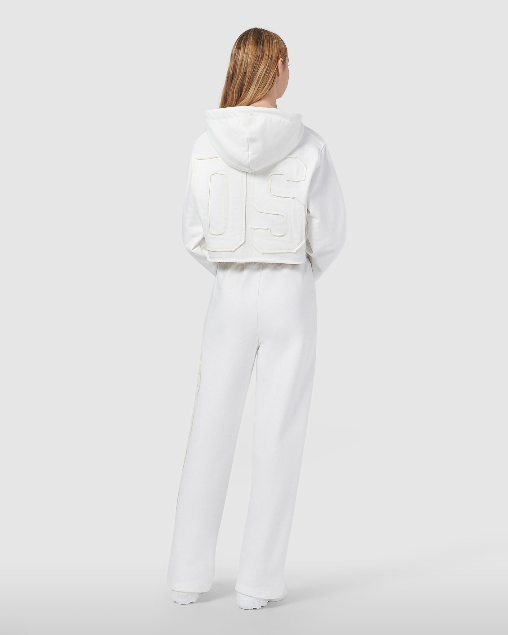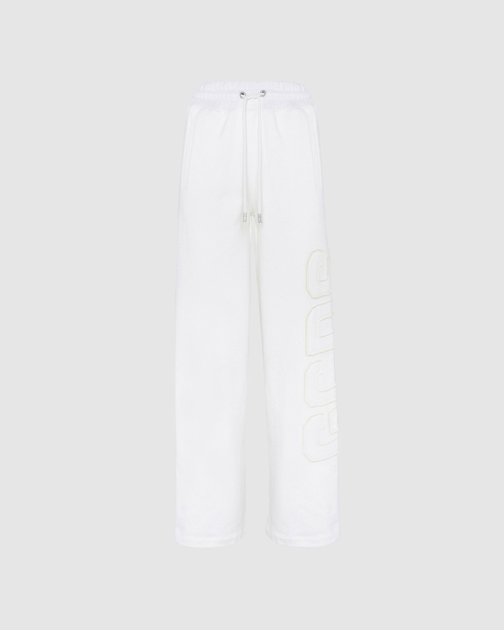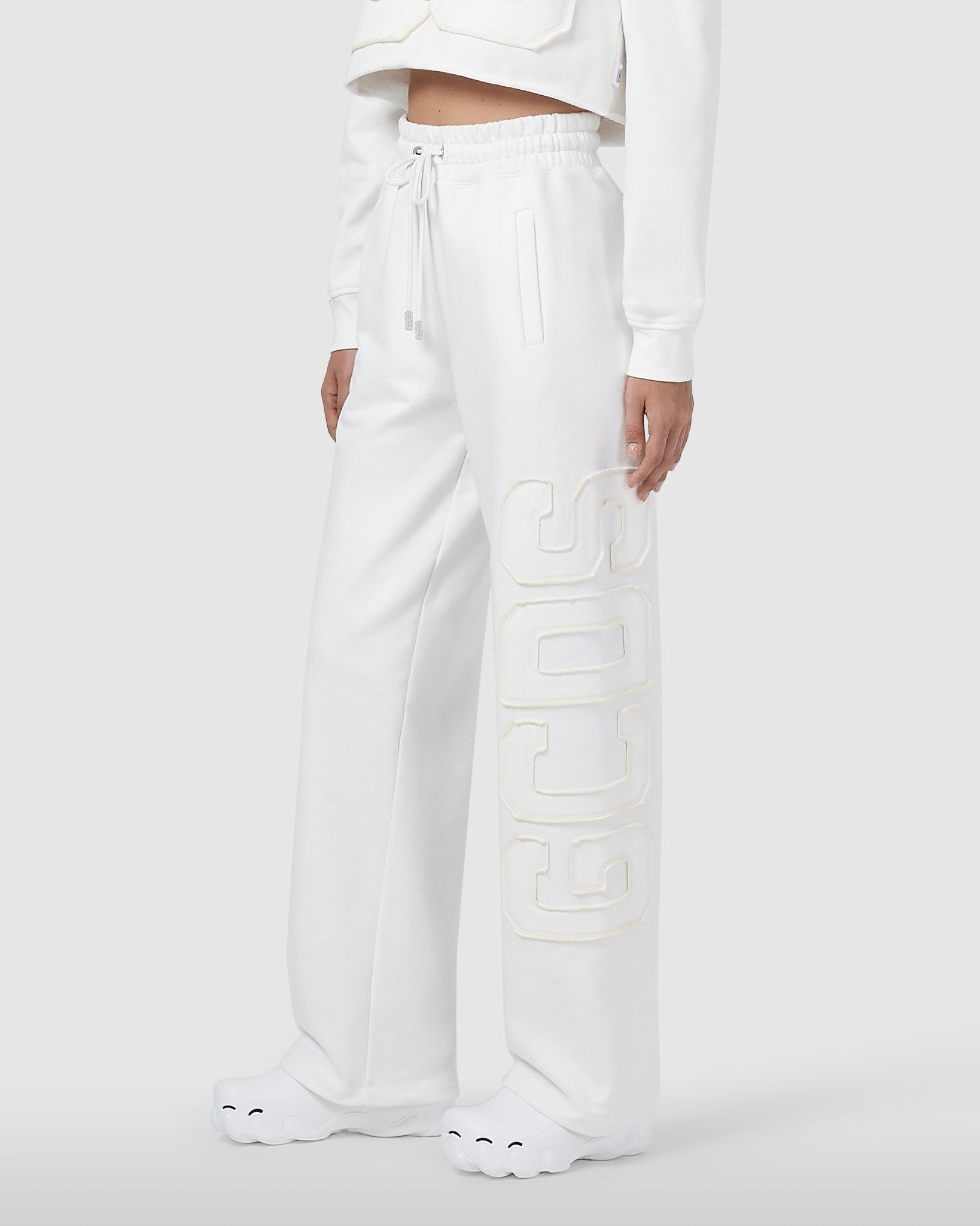 GCDS high-waisted cotton sweatpants with appliquéd frayed-cut logo with matching topstitching on the left leg. Welt pockets and elastic waistband. Very relaxed fit, palazzo-leg cut, seamless on the hip.