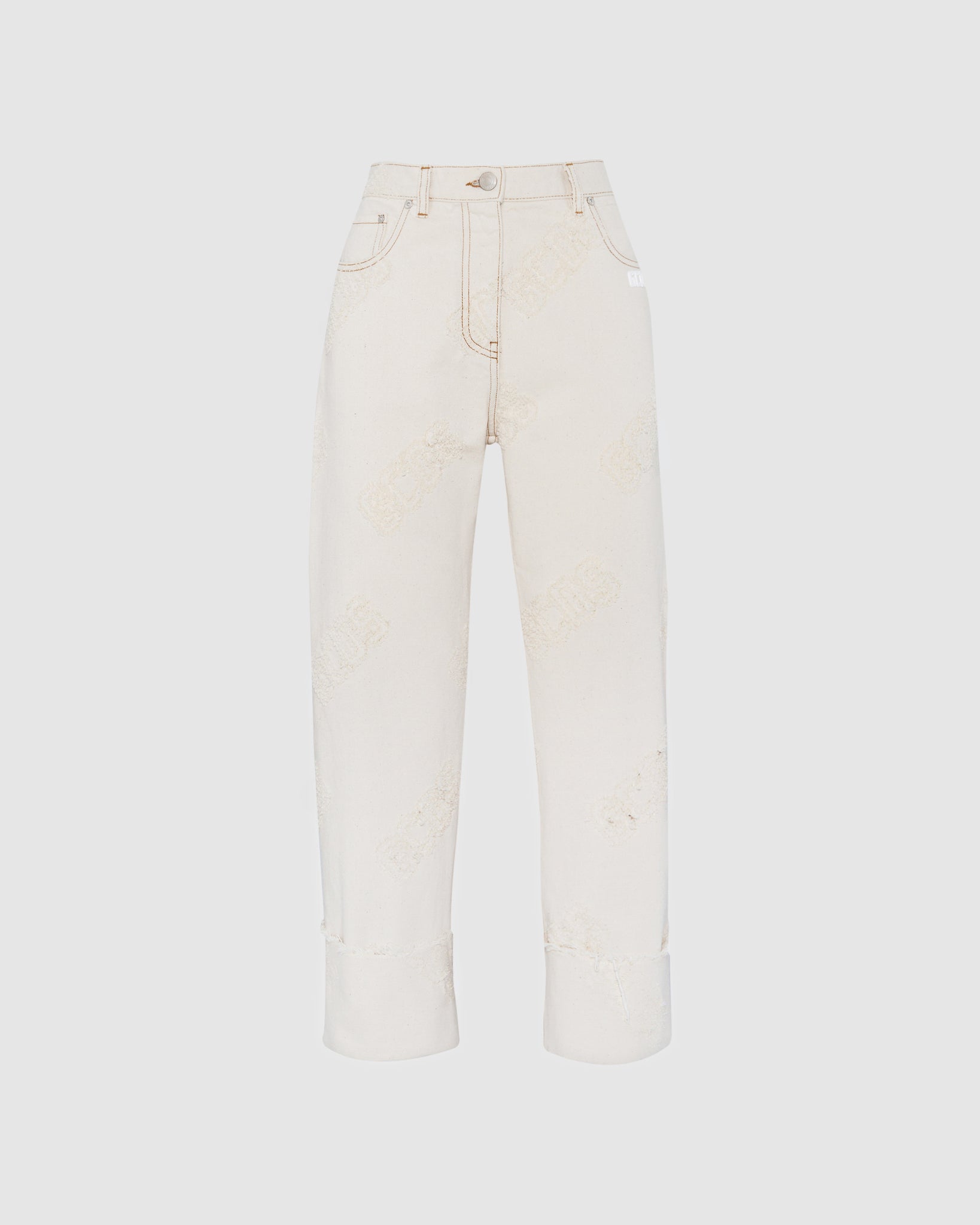 Low-waisted GCDS denim jeans with bouclé effect laser logo and contrasting tobacco-colored topstitching. Raw-cut at the bottom and turn-up with contrasting topstitching. Regular fit, loose leg cut.