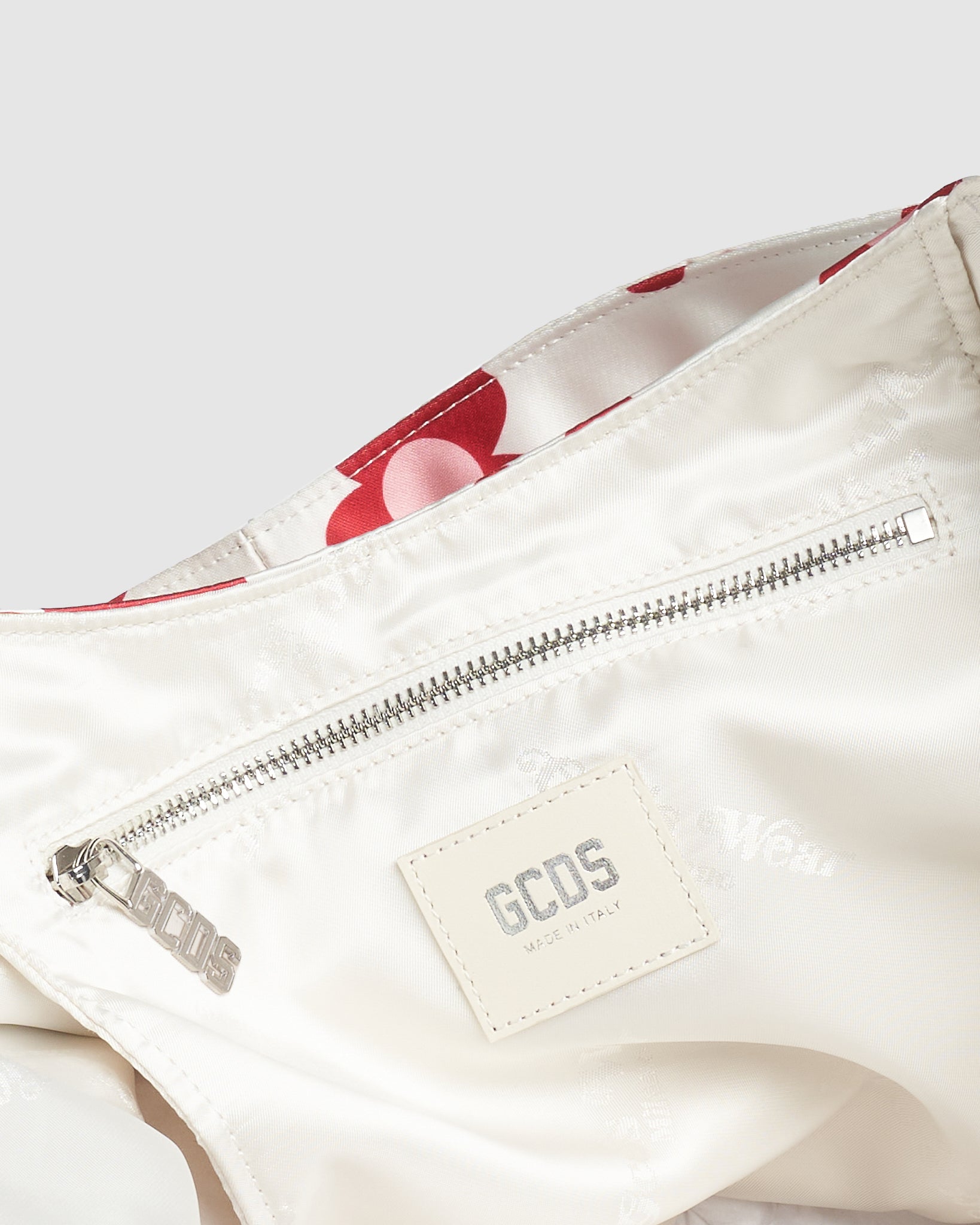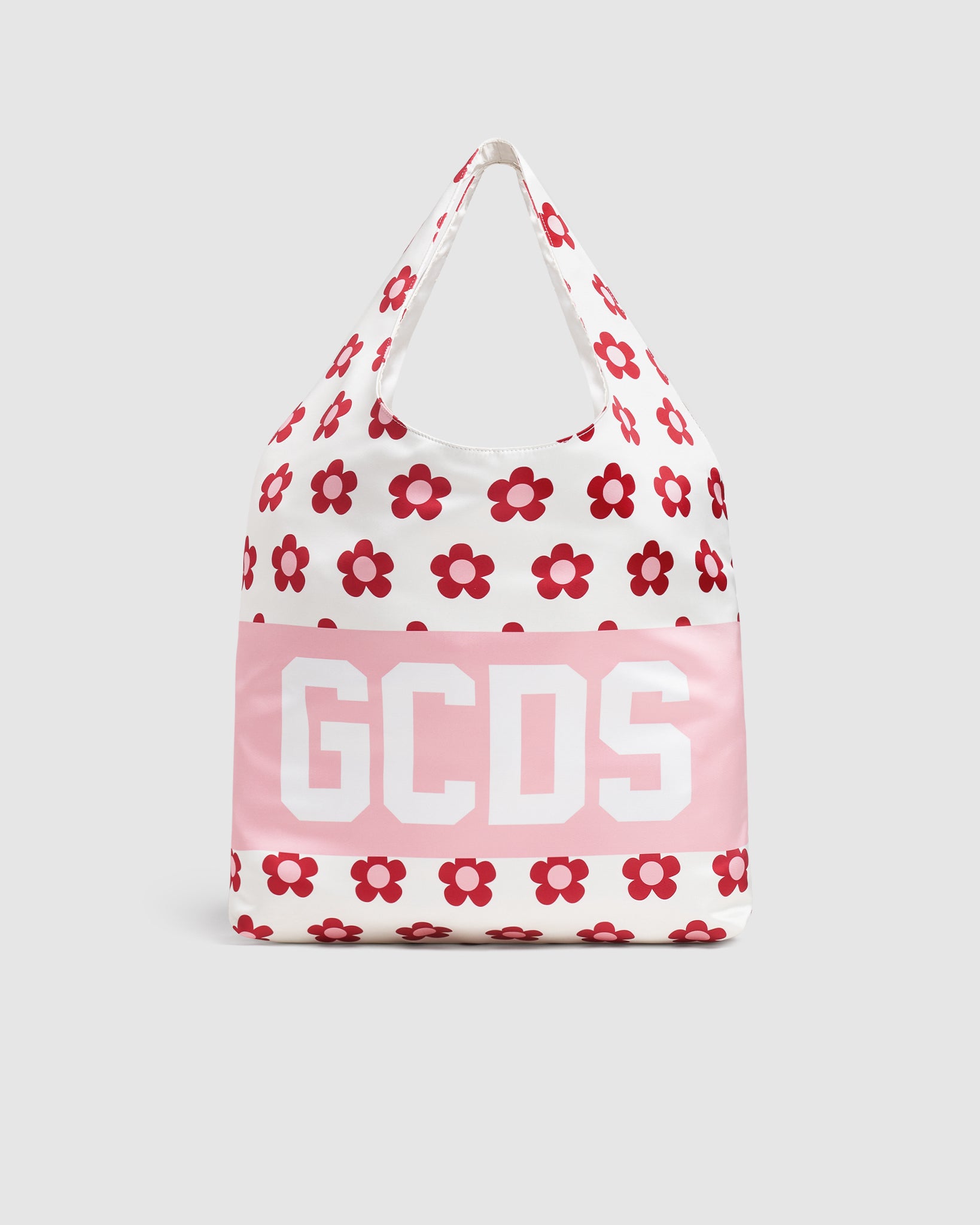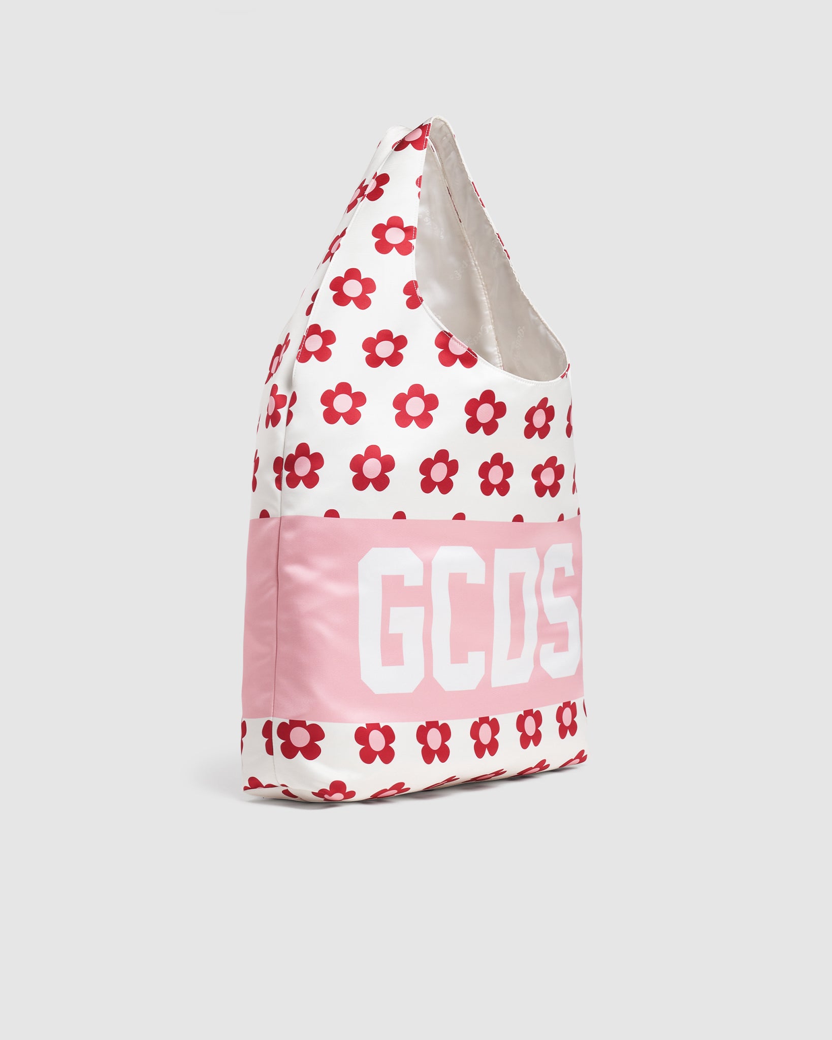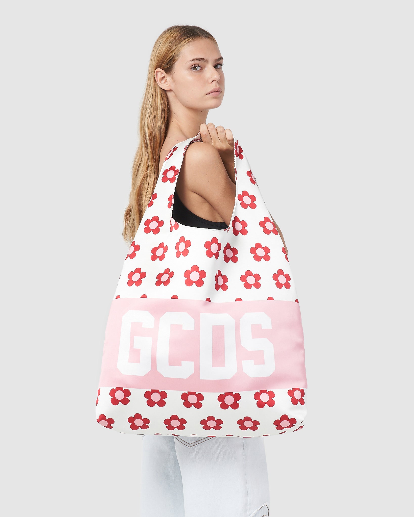 GCDS maxi satin shoulder shopper with all-over daisy motif pattern print and GCDS logo band. On the inside, jacquard logo lining, open pocket on the bottom and leather patch with heat-embossed logo.