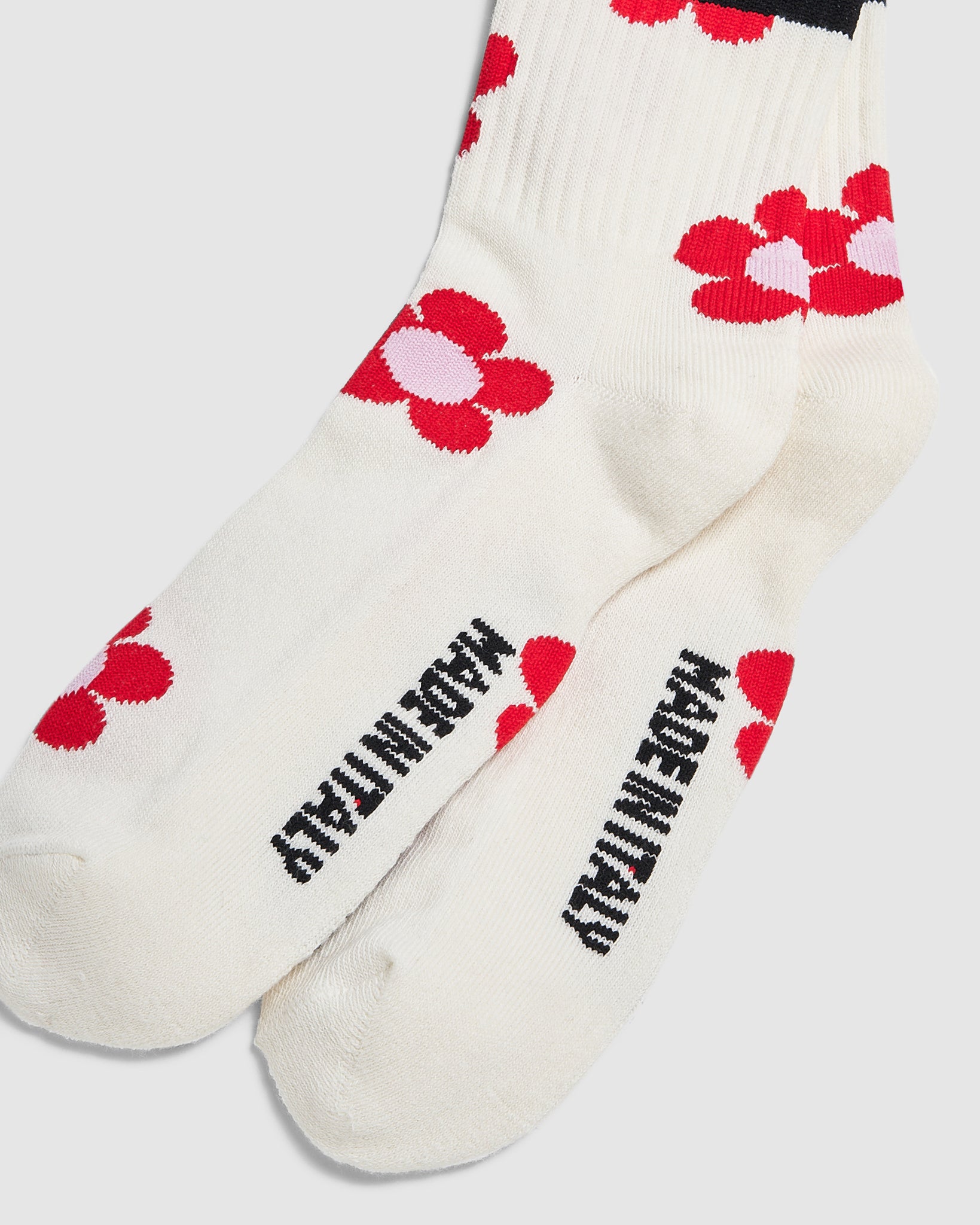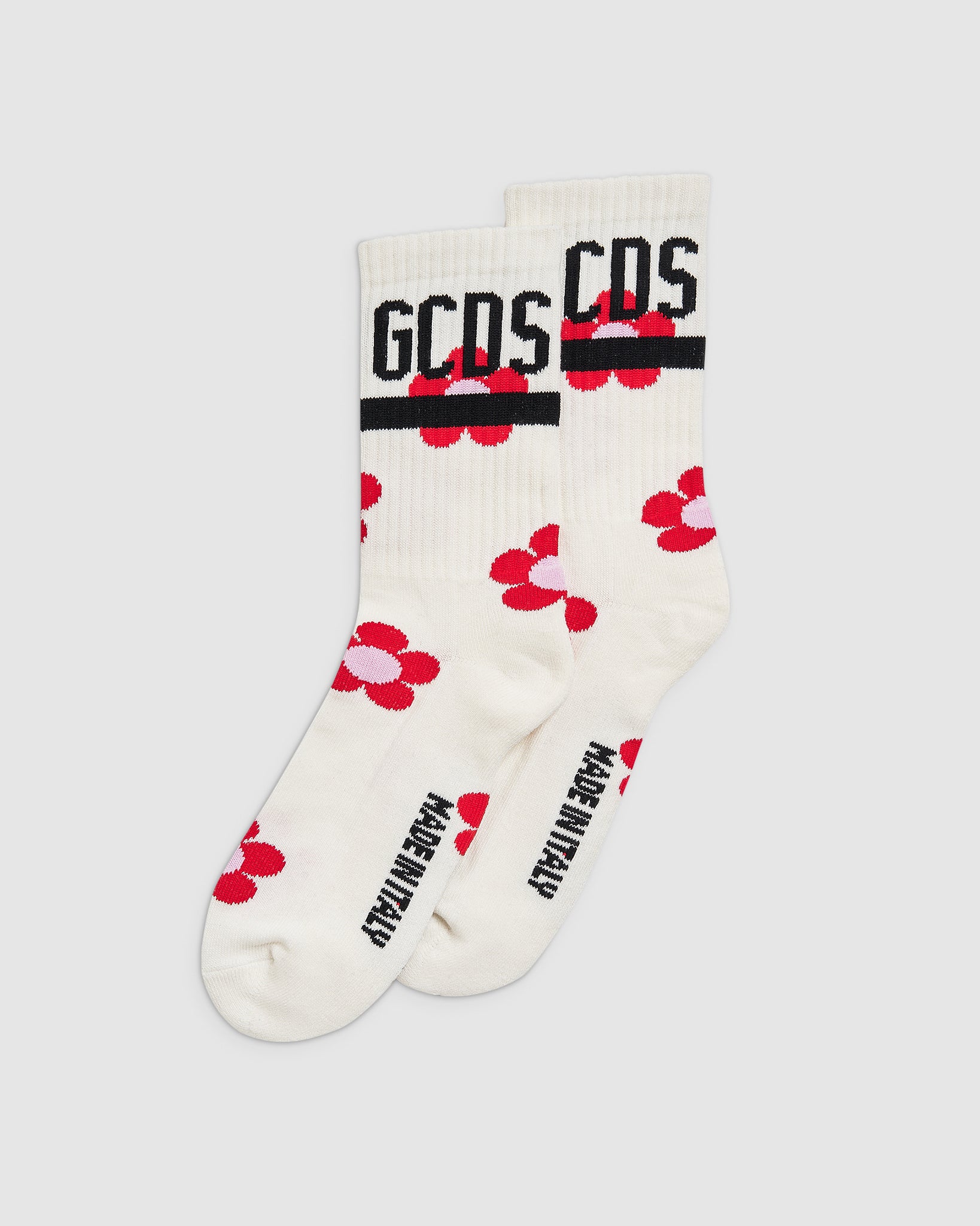 GCDS socks in rib knit cotton blend with inlaid logo and all-over daisy motif pattern. “Made in Italy” graphic on the sole.