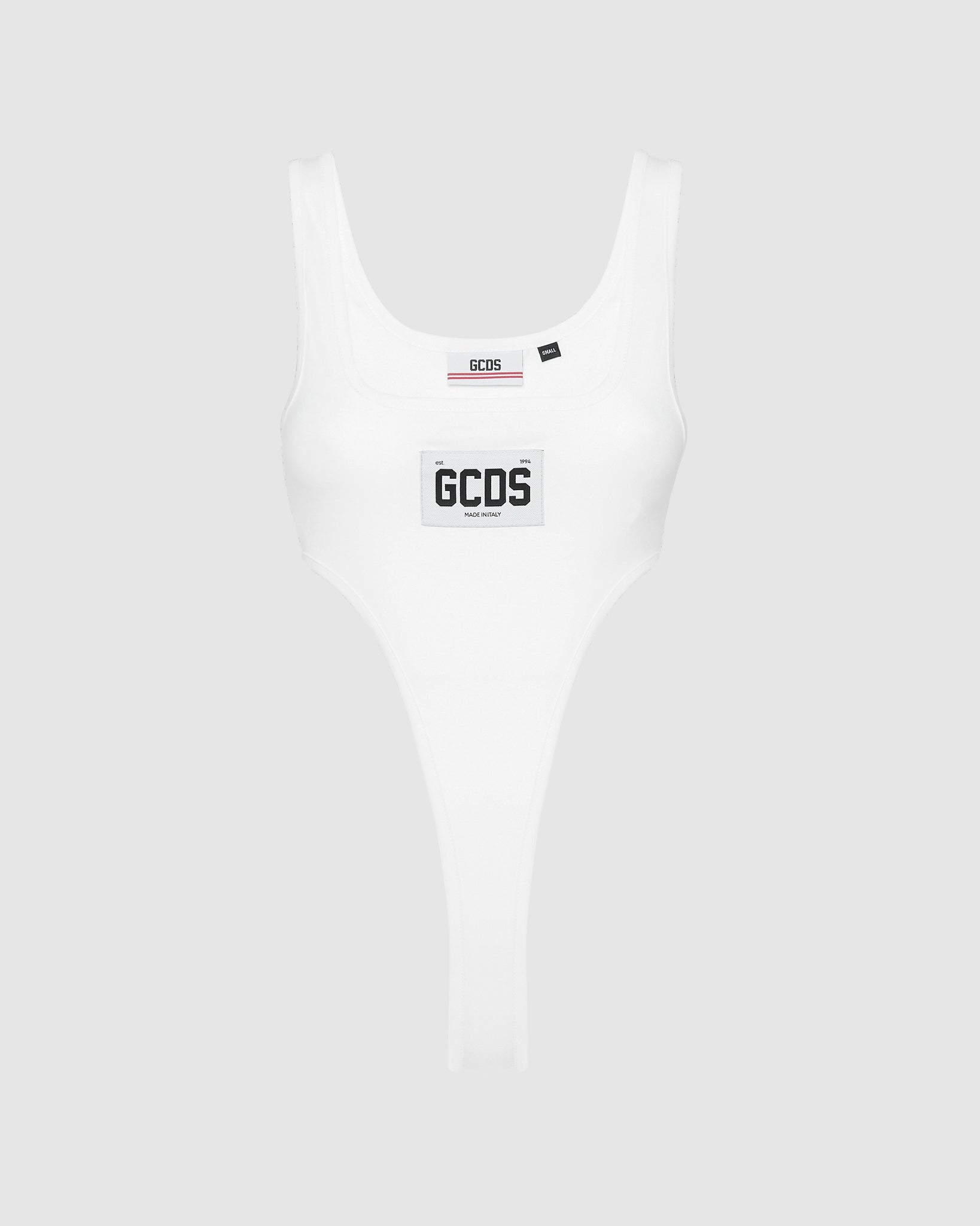 GCDS cotton bodysuit with very high leg contour on the sides. Logo patch in jacquard fabric appliquéd on the center front. Slightly boxy neckline.