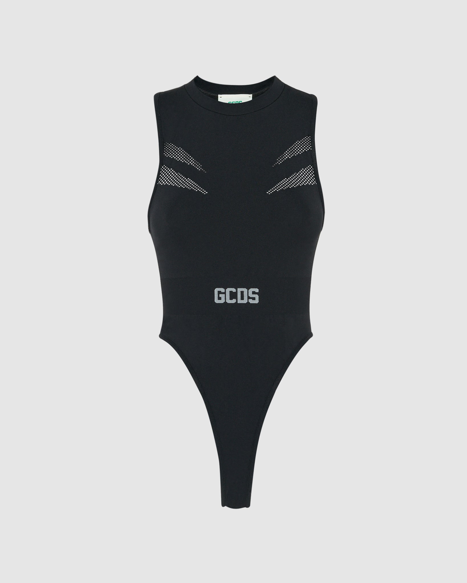 GCDS recycled polyester bodysuit with wide armholes and a very high leg contour on the sides. Mesh detail on the front and holes on the center back. Elastic waistband with contrasting logo on the center front. Made using the seamless technique.