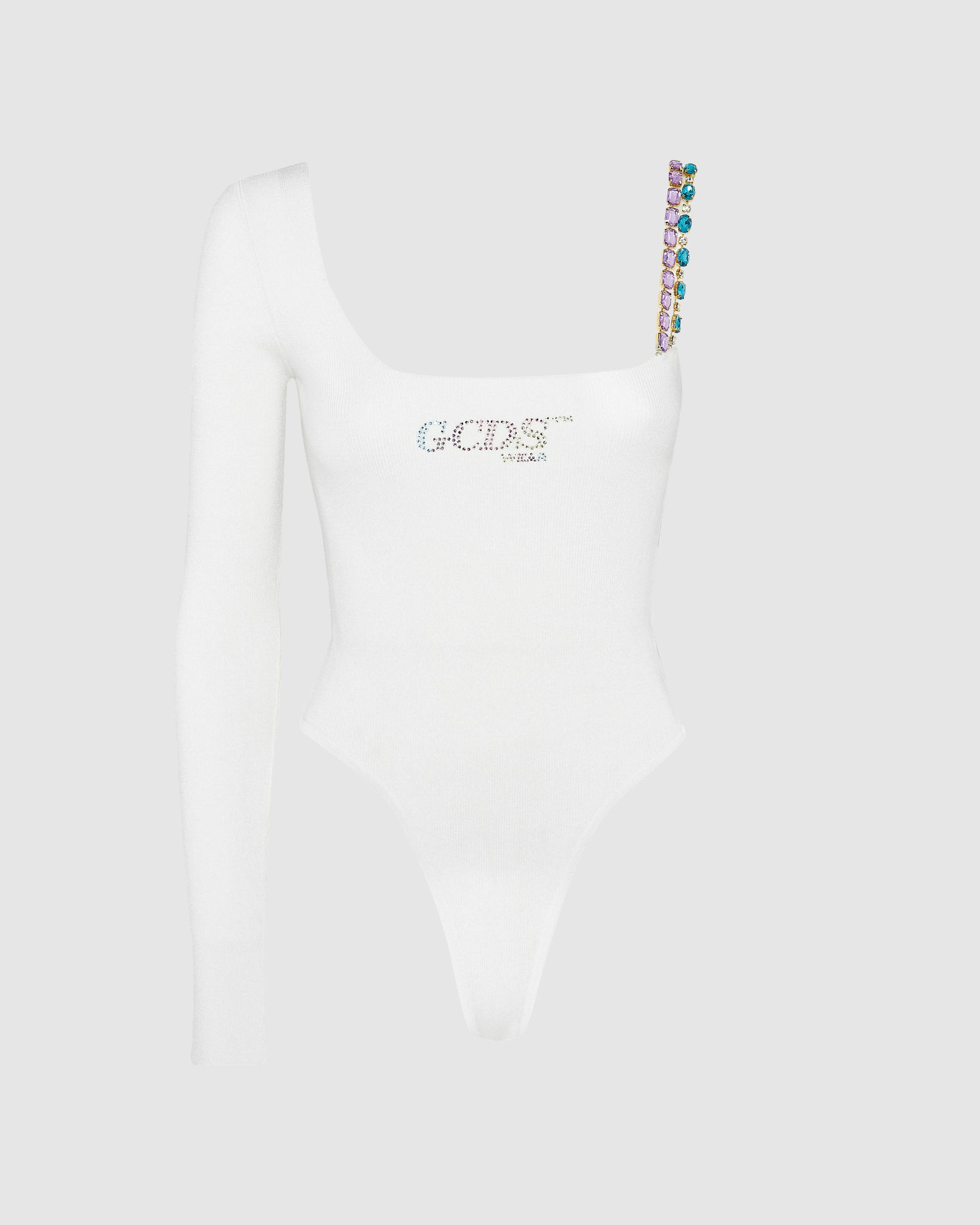 GCDS long-sleeved one-shoulder solid knit bodysuit. Logo detail in heat-set rainbow crystals by Preciosa on the front. Left shoulder strap with double chain of two-tone stones.