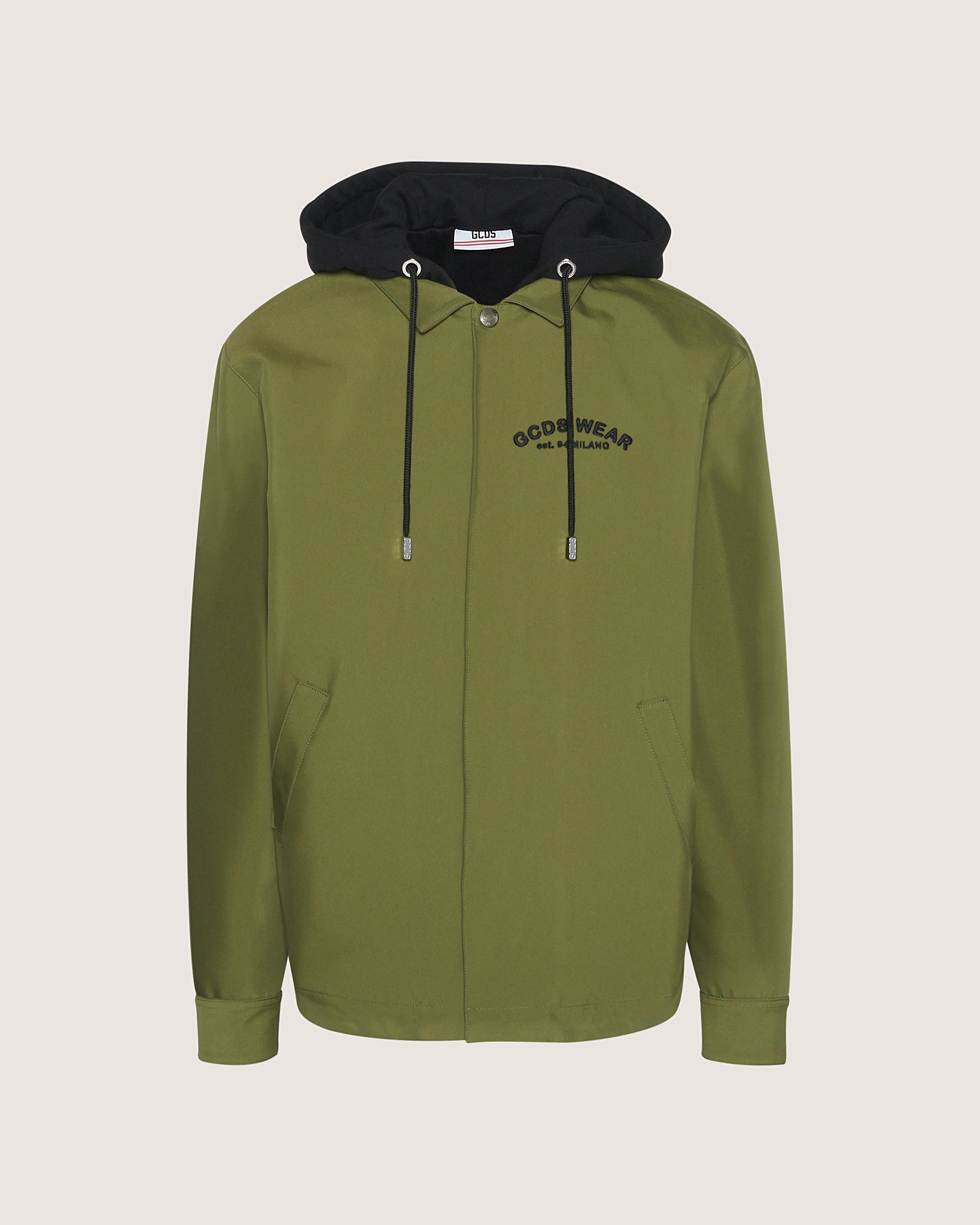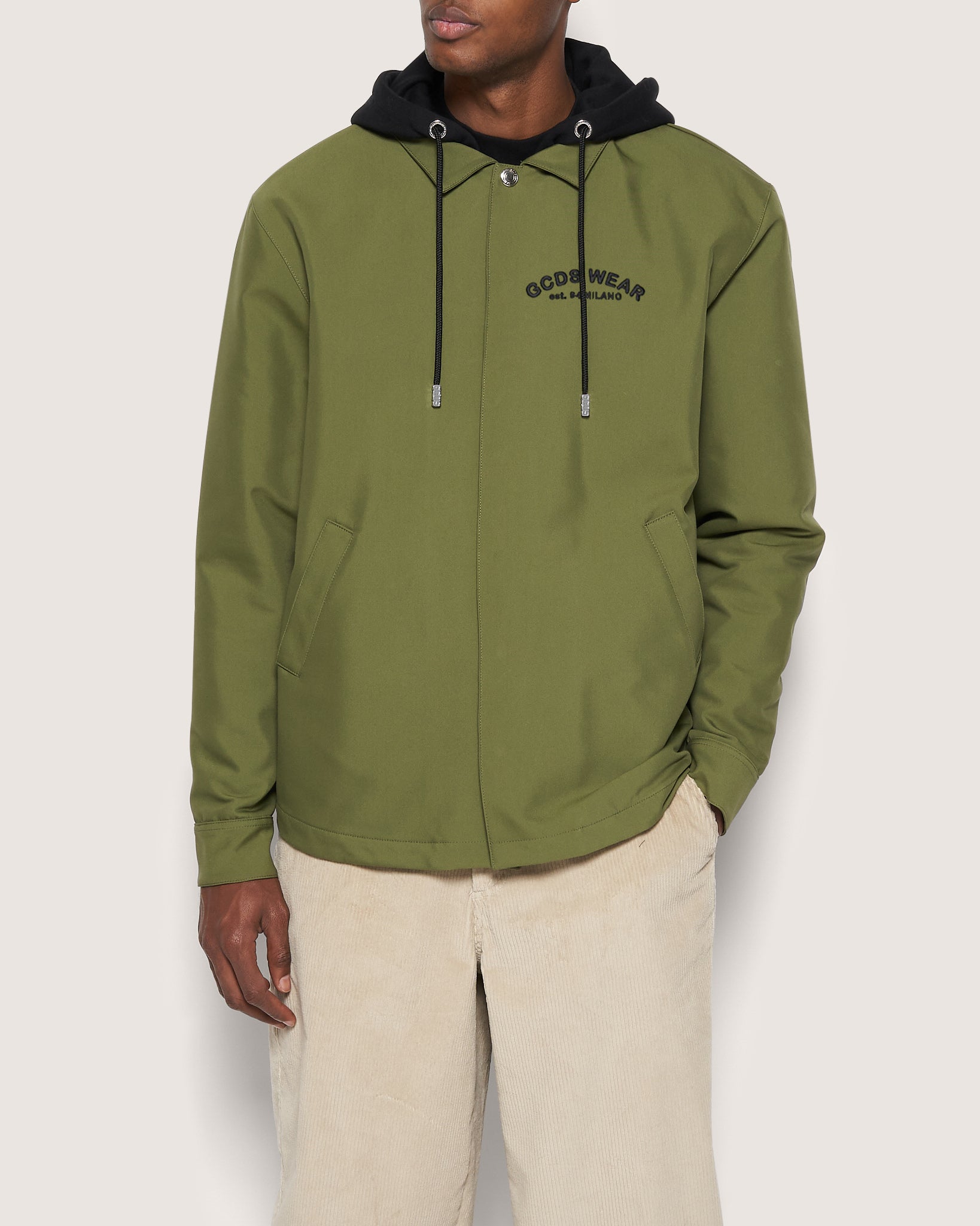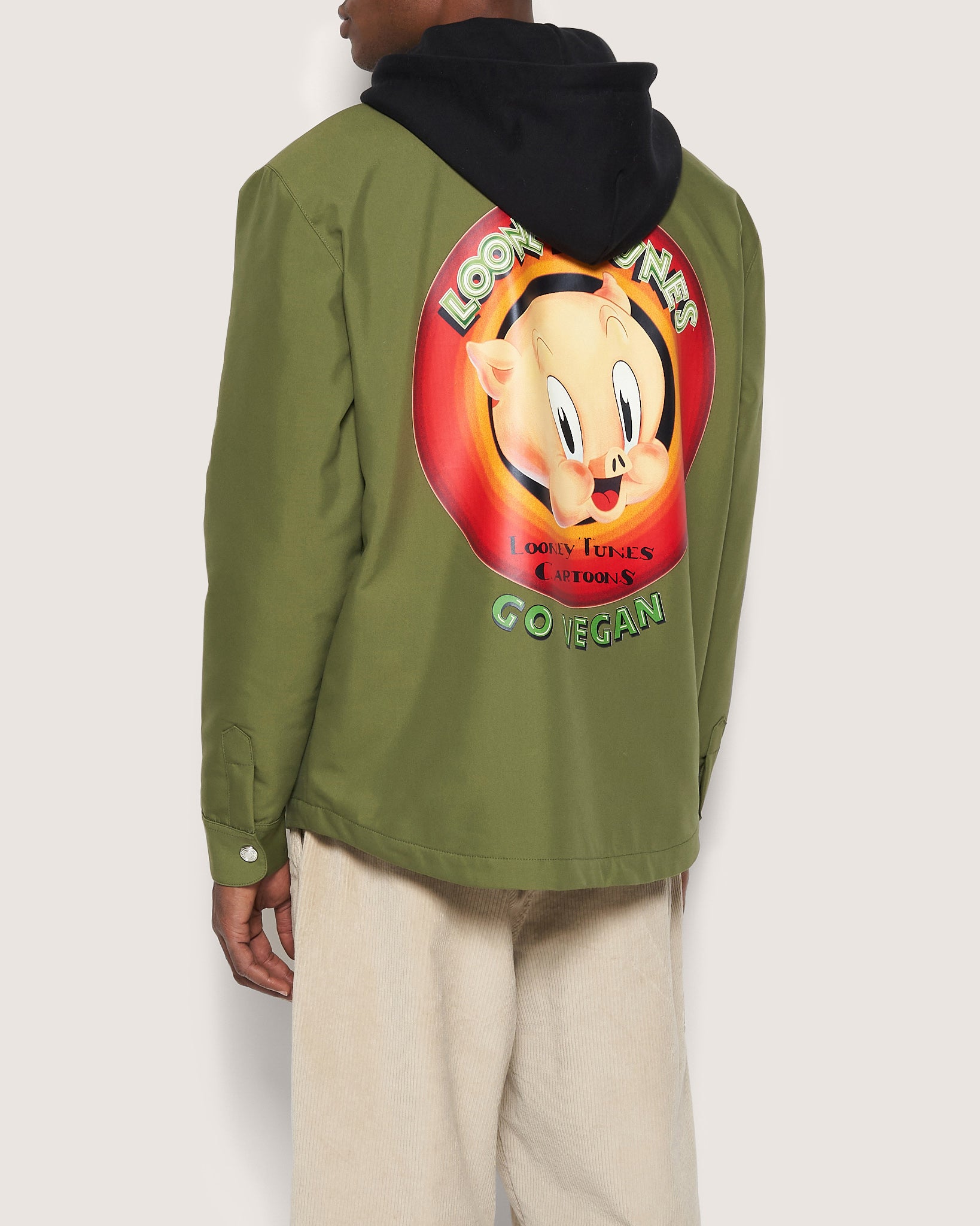 GCDS maxi shirt in cotton canvas, with fleece-lined hood. On the front, at the pocket height, GCDS Wear embroidery. Side pockets. Button-snaps at the wrist. On the back, silkscreen print from the seasonal Looney Tunes collection.
