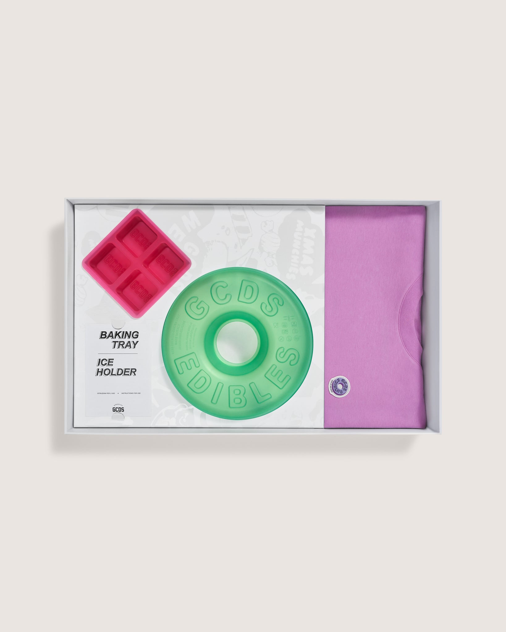 The candy themed gift box includes an ‘edibles’ printed cotton t-shirt, an ice cube tray and a ‘GCDS edibles’ cake mold.