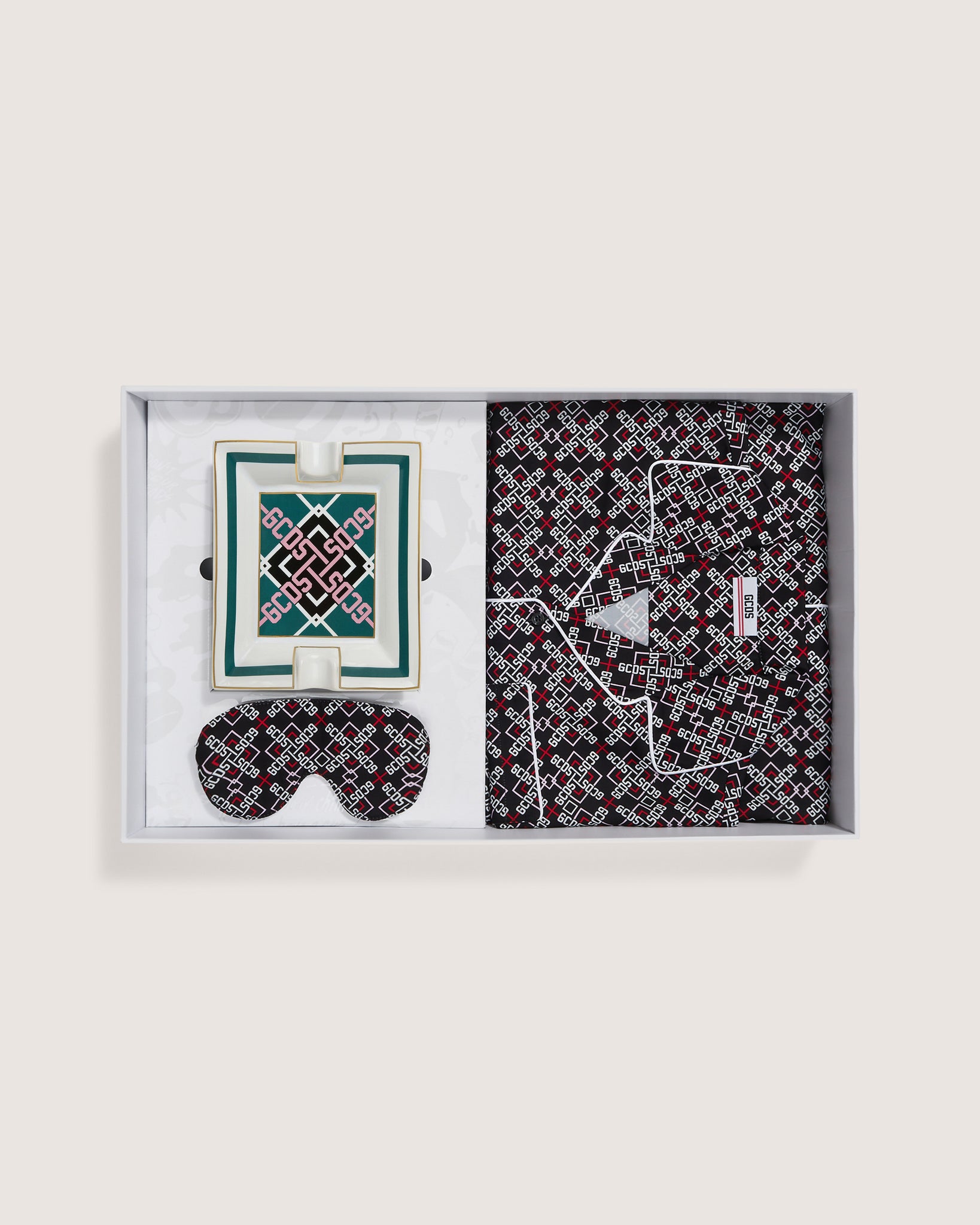 Logo lounger is the kit for those looking to relax. The gift box includes a two-piece printed pajama set, an ashtray and a sleep mask characterized by a distinctive logo pattern.